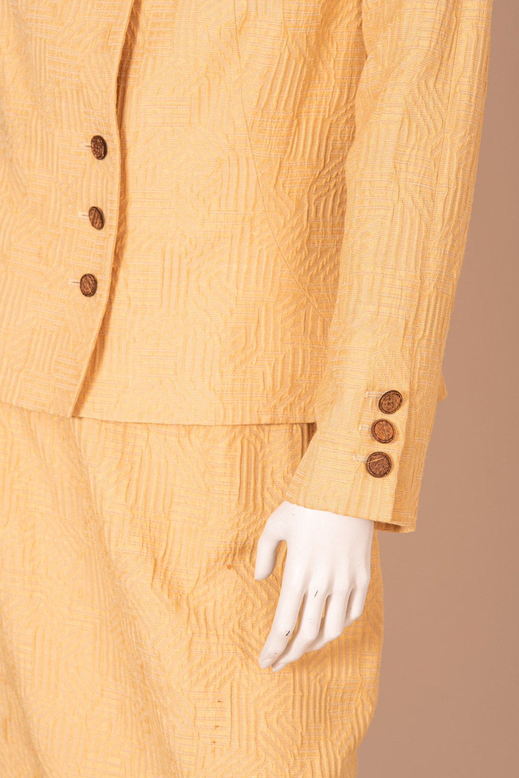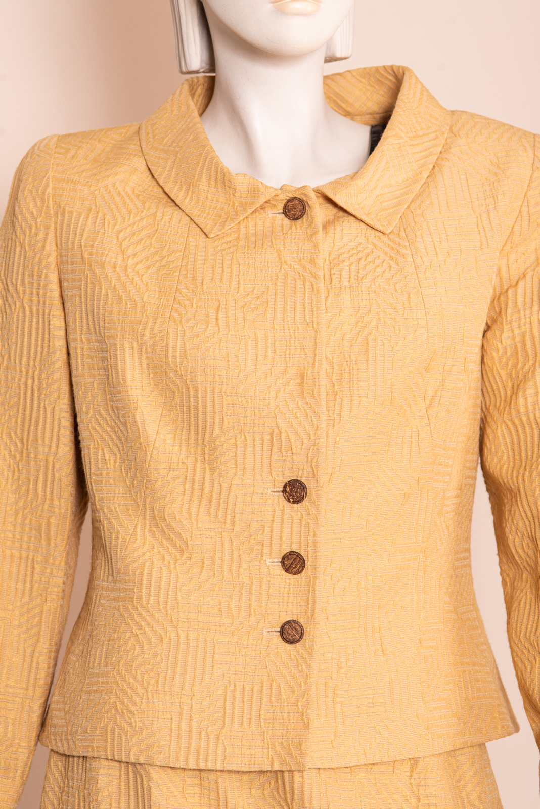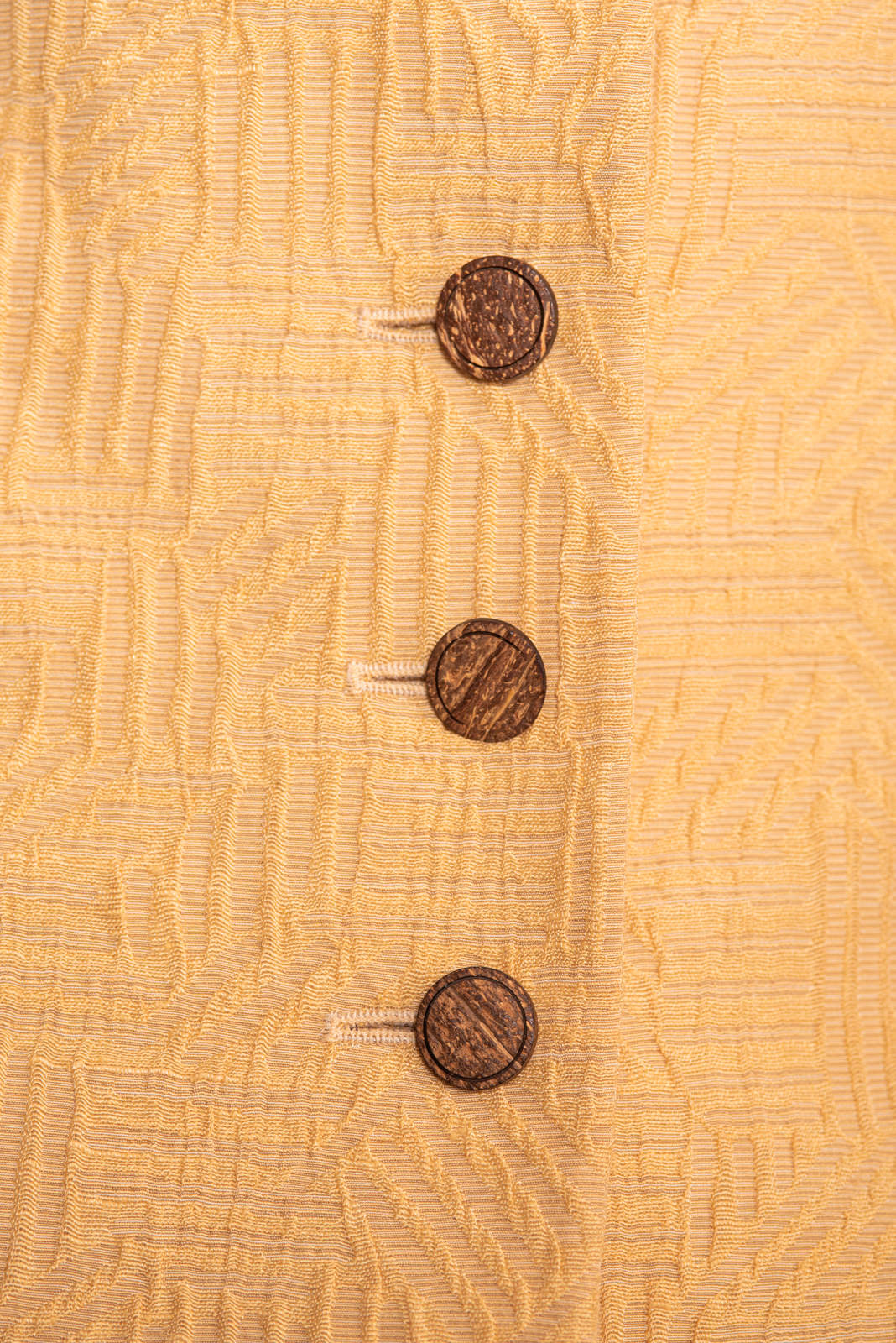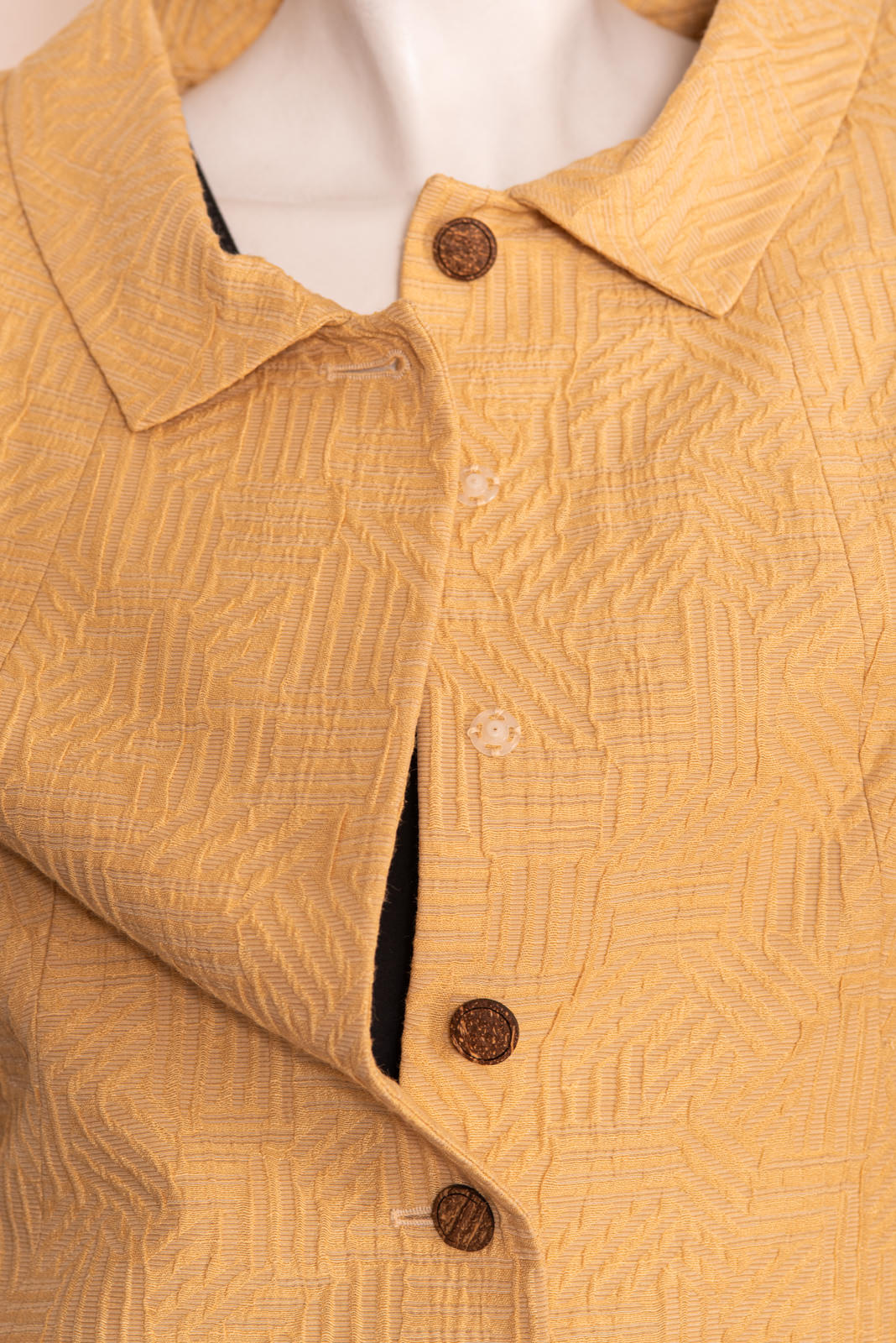 - Wood round button up closure with invisible snap fasteners for a couture visual effect when the jacket is closed