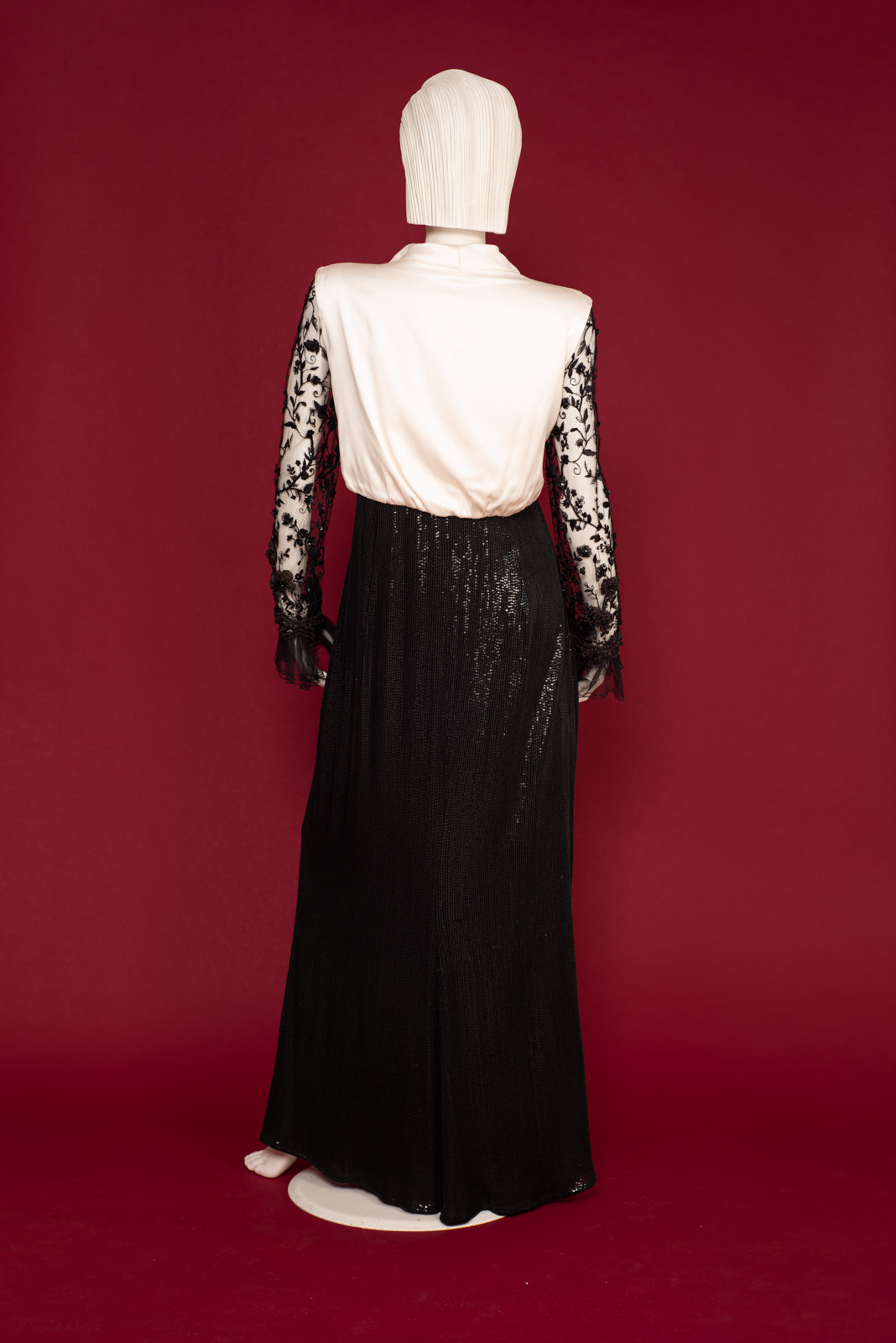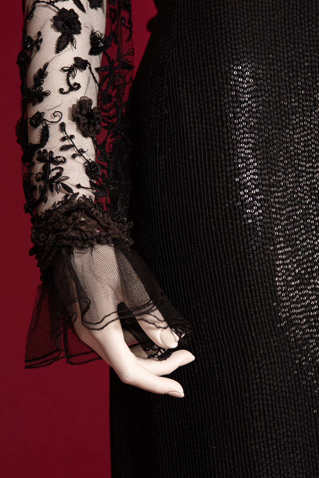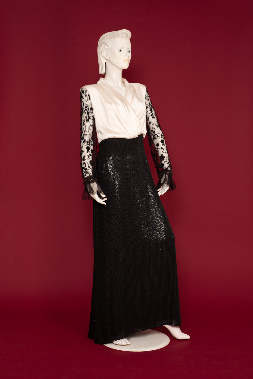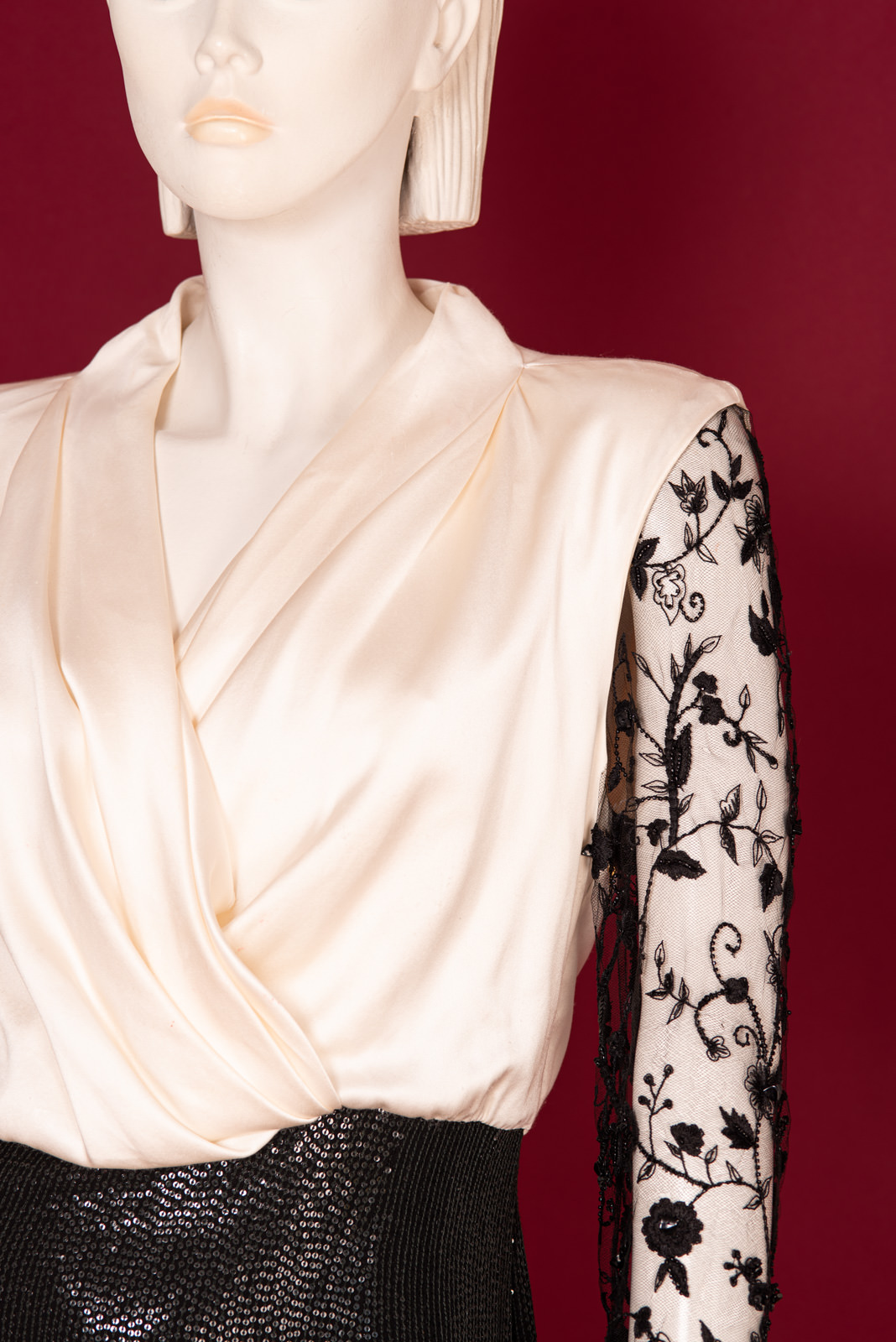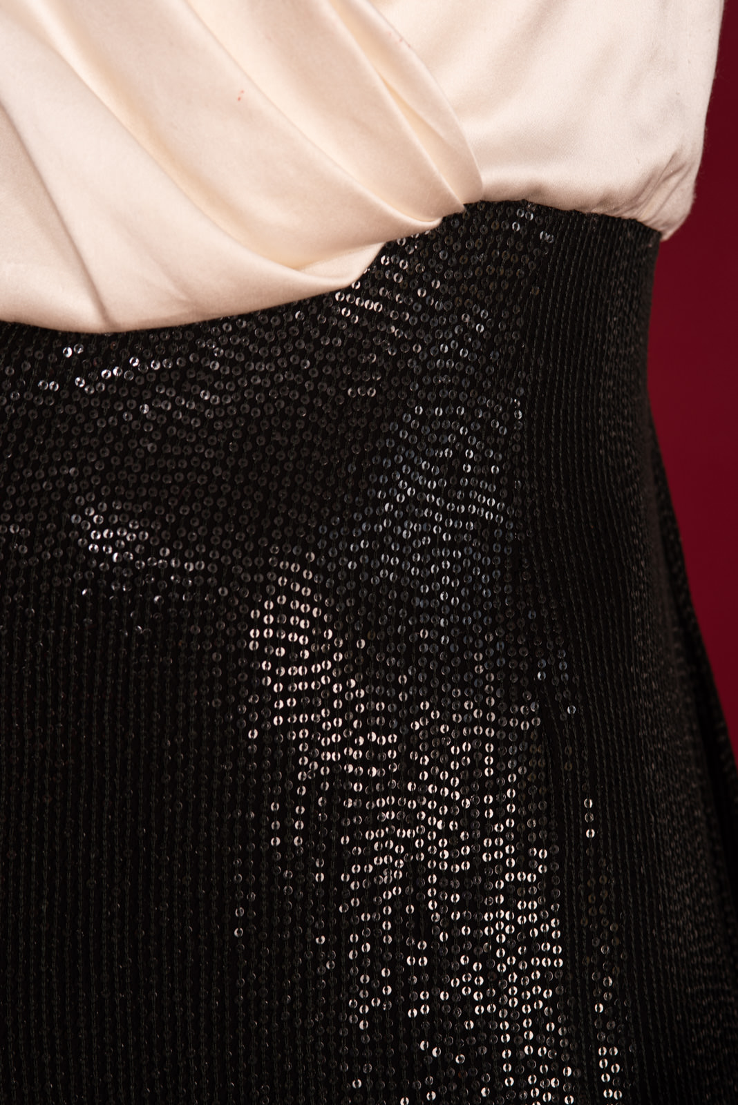 - Composition : No fabric tag, the top is 100 % silk, lace and guipure, the skirt is 100 % silk embroidered with sequins