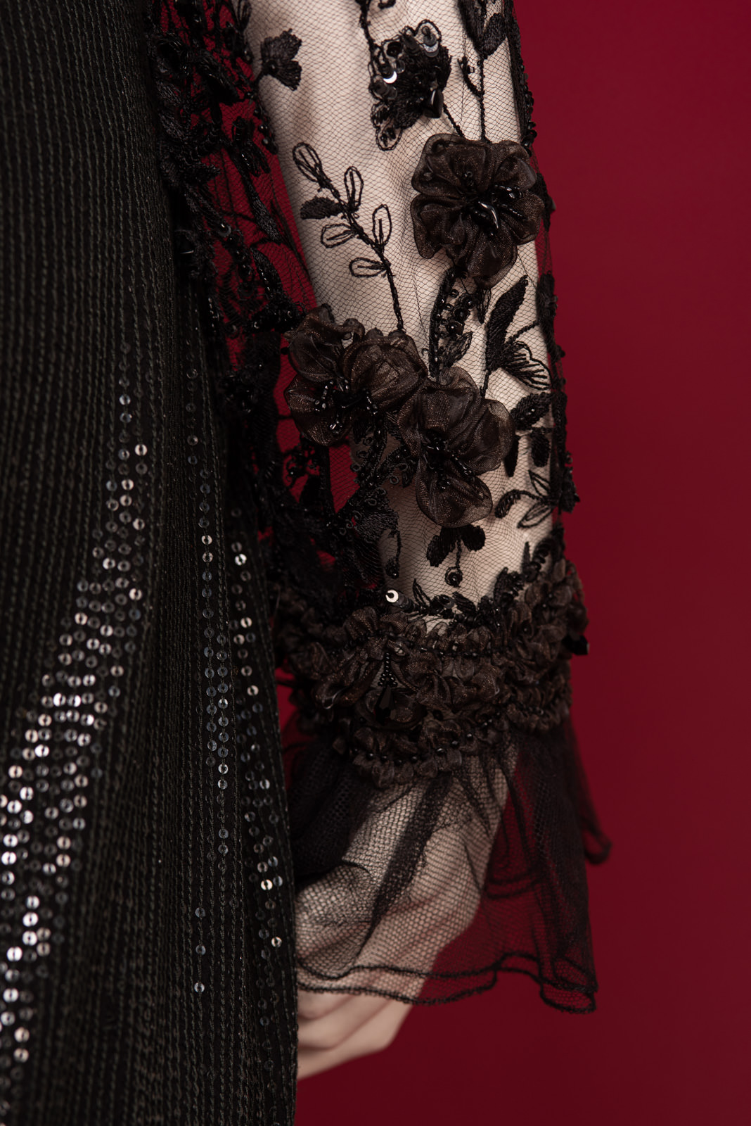 - Long lace and tulle sleeves embroidered with flower-shaped pearls and sequins