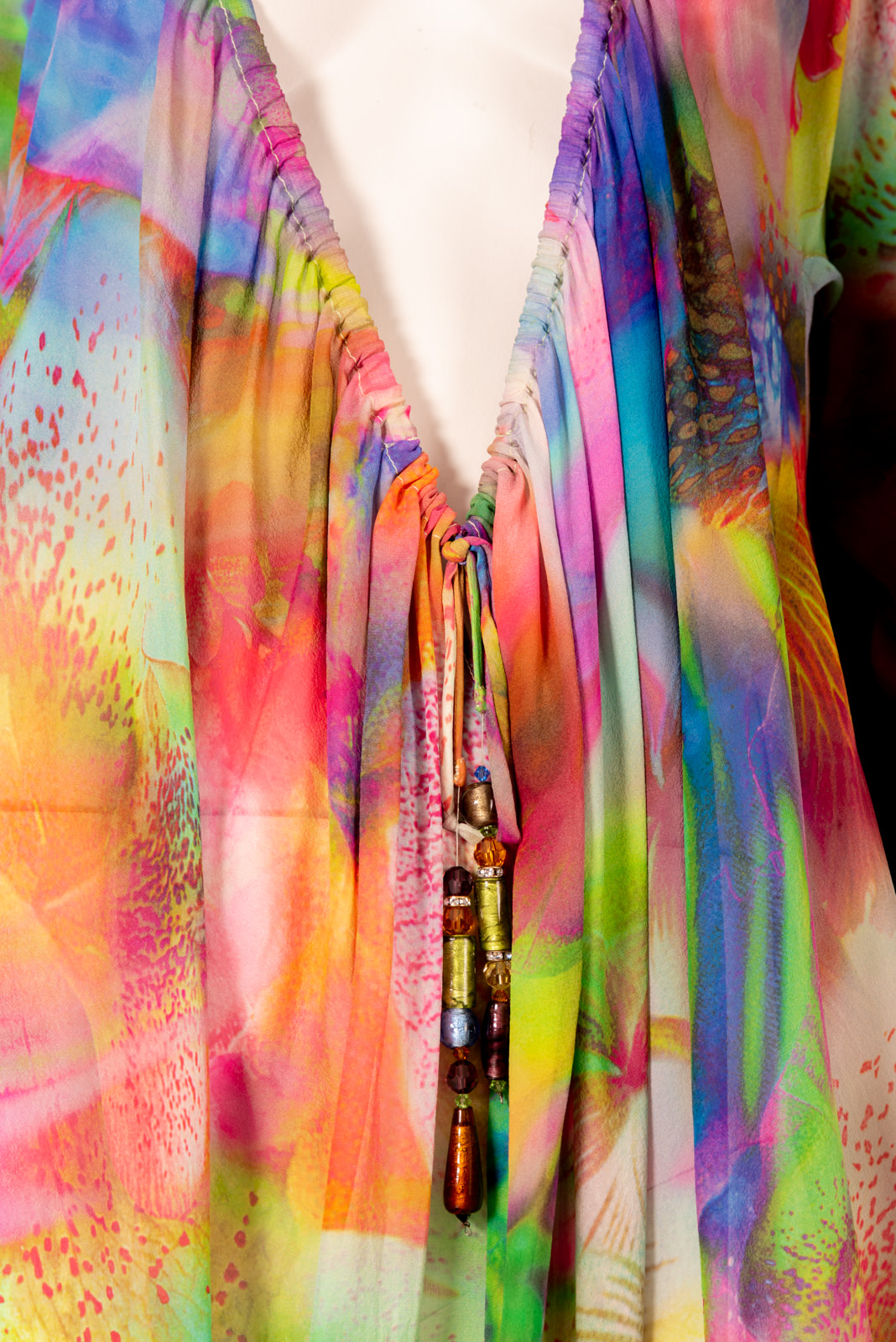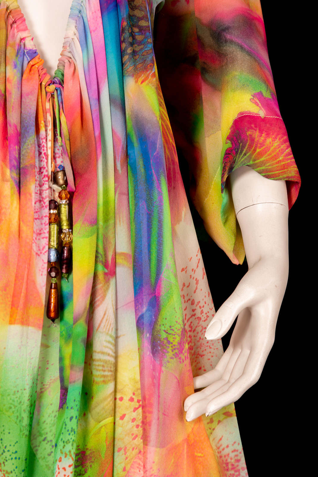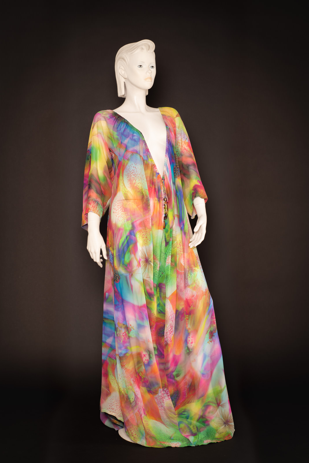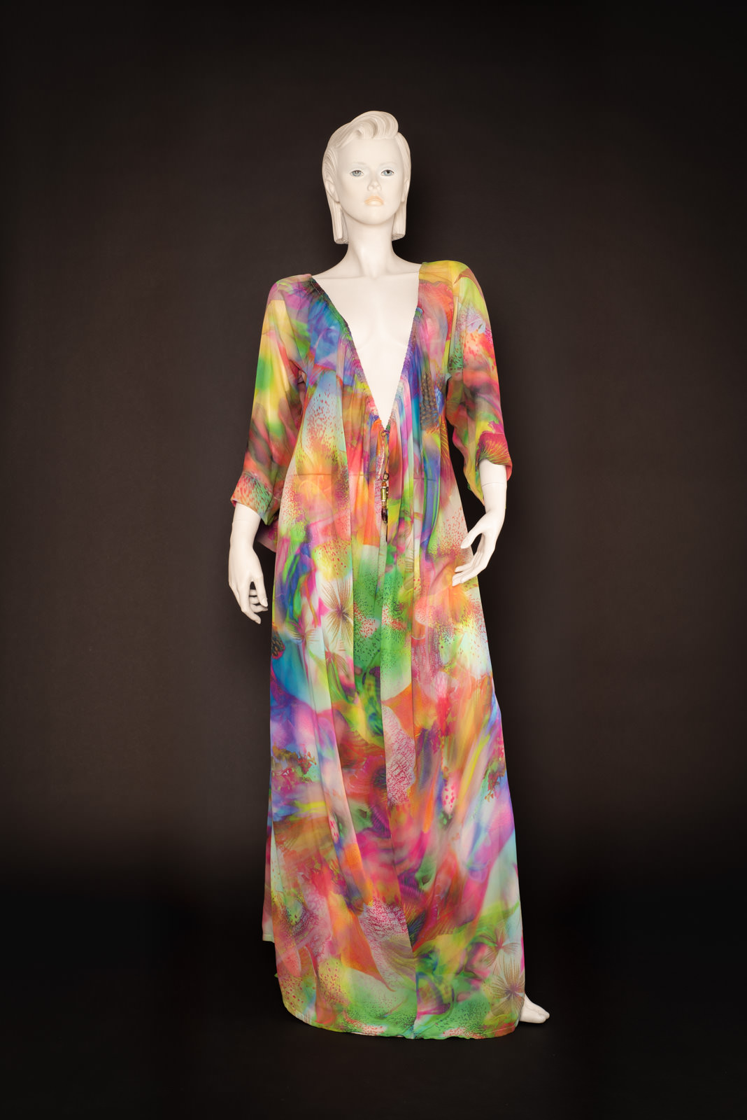 - Large silk chiffon djellaba with a summery abstract floral print