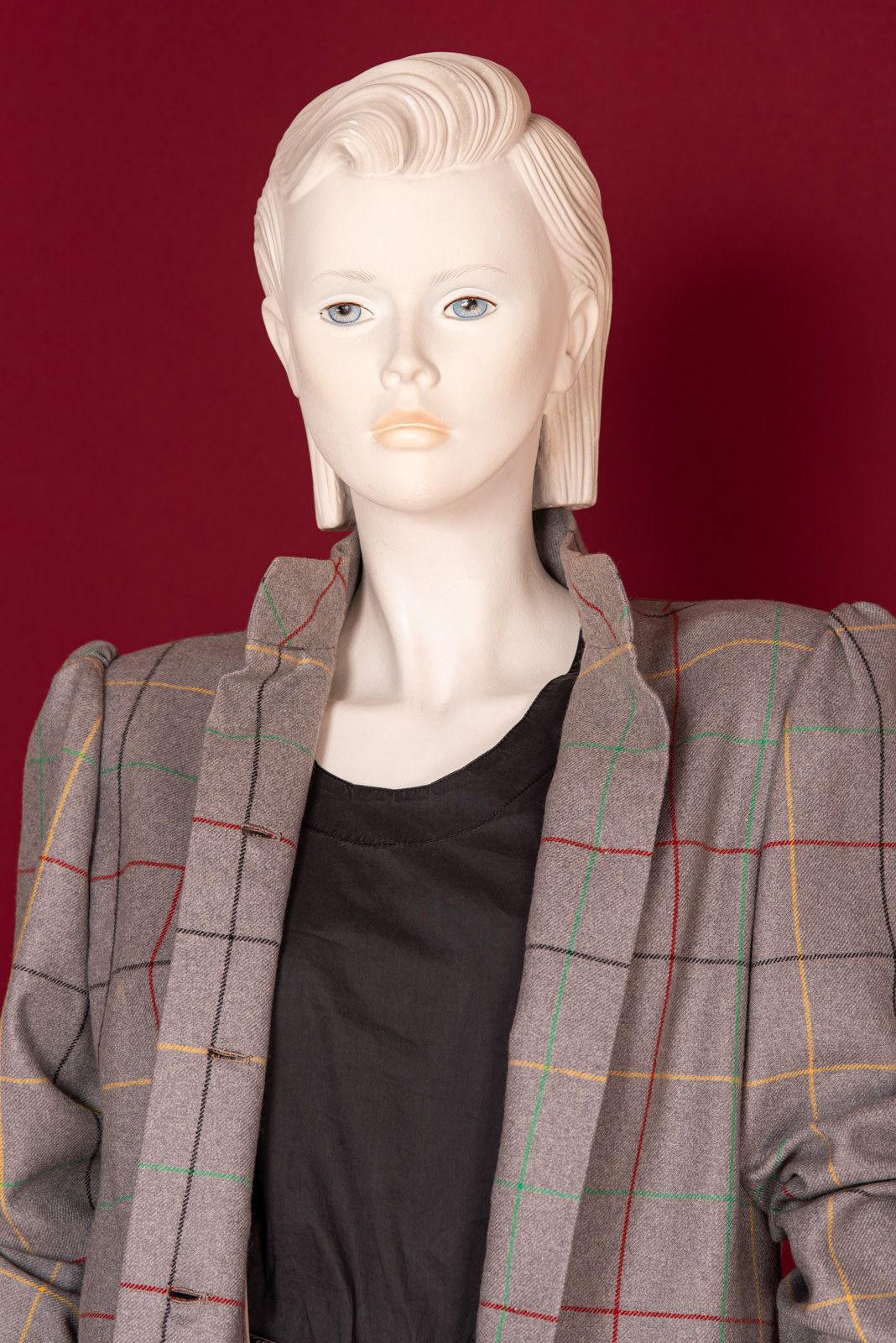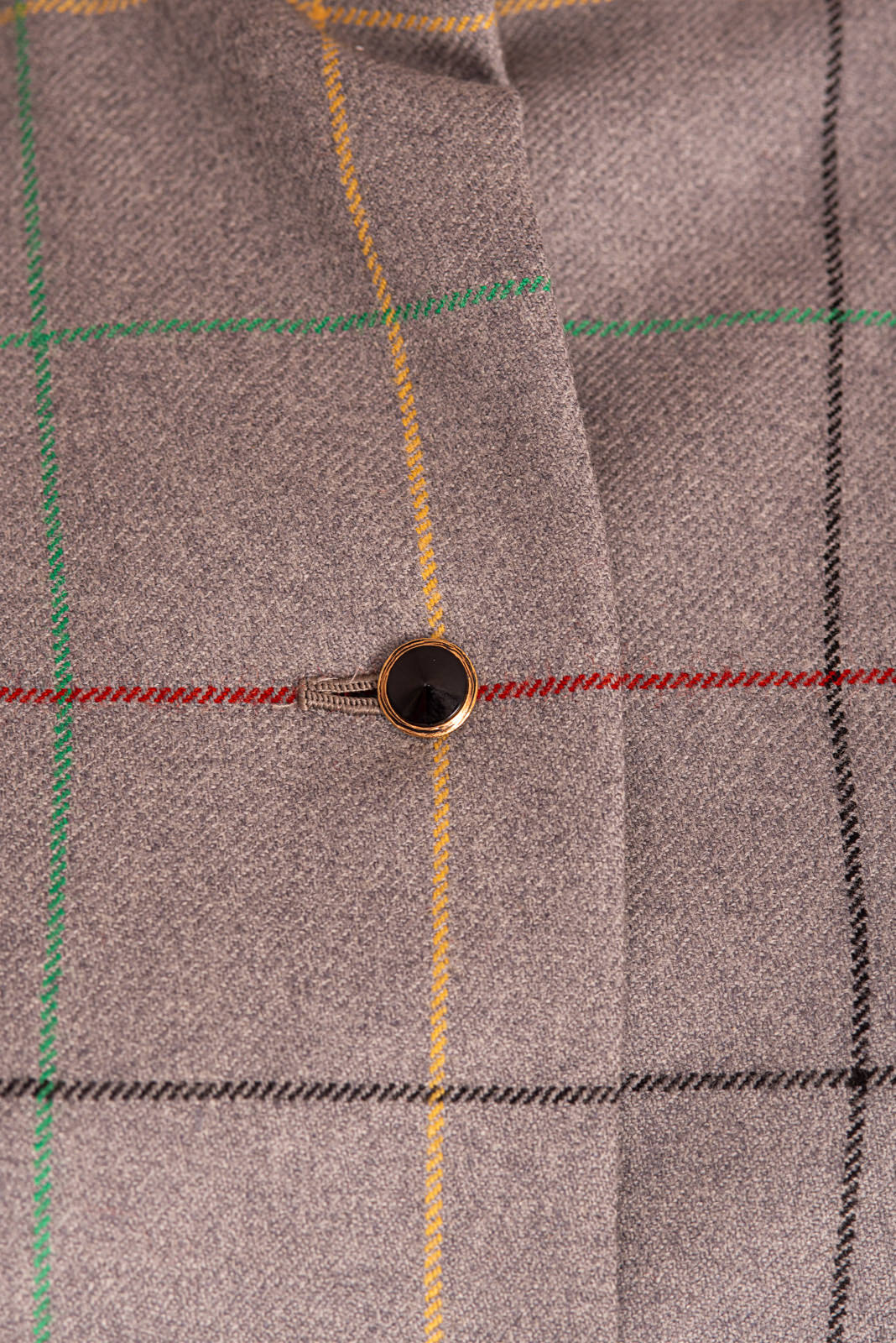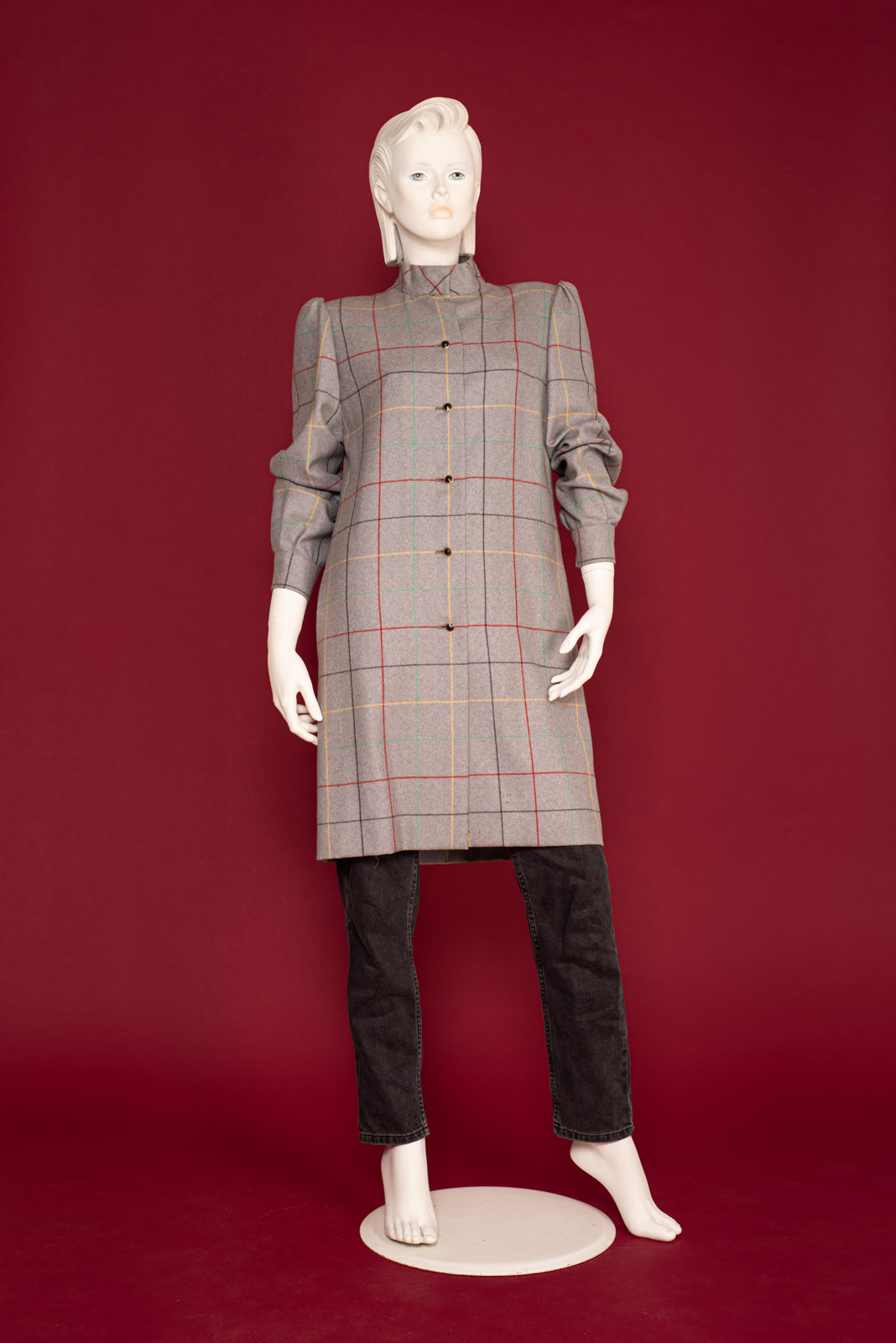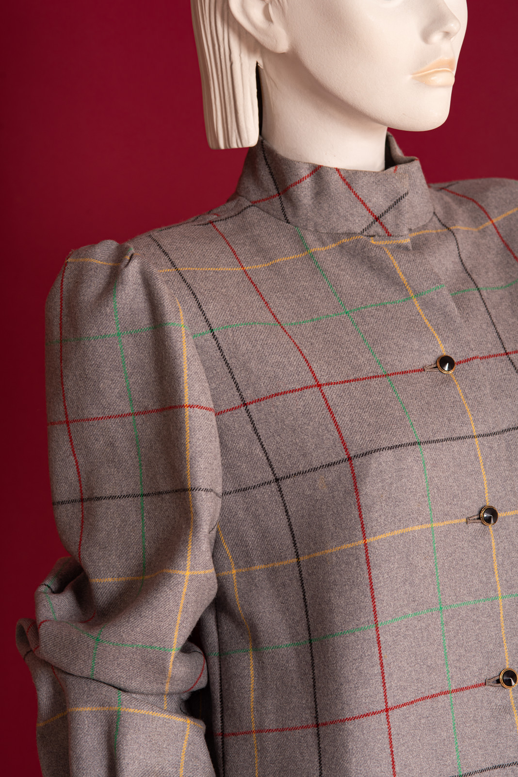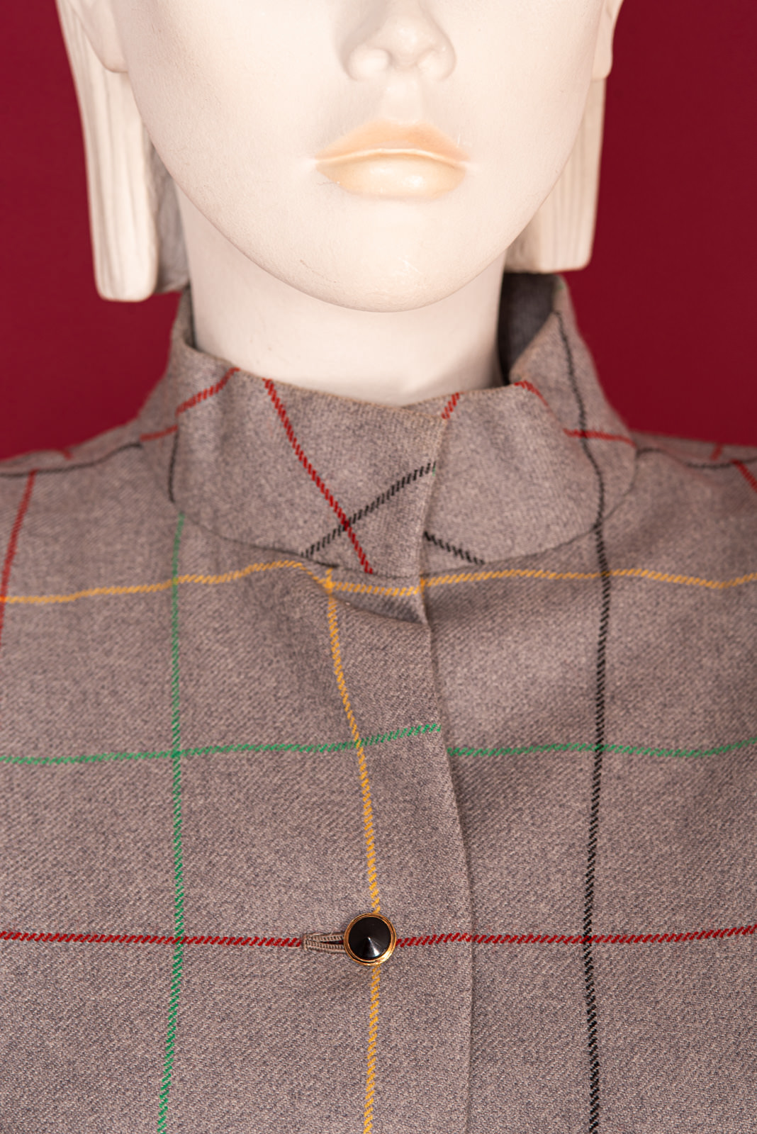 Lavish Galanos Haute Couture grey woolen coat from the 1990s sold at Saks Fifth Avenue, with a chic colorful checkered pattern.