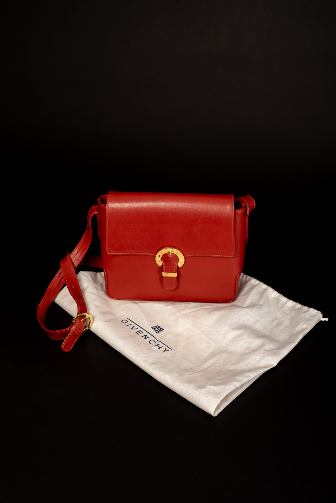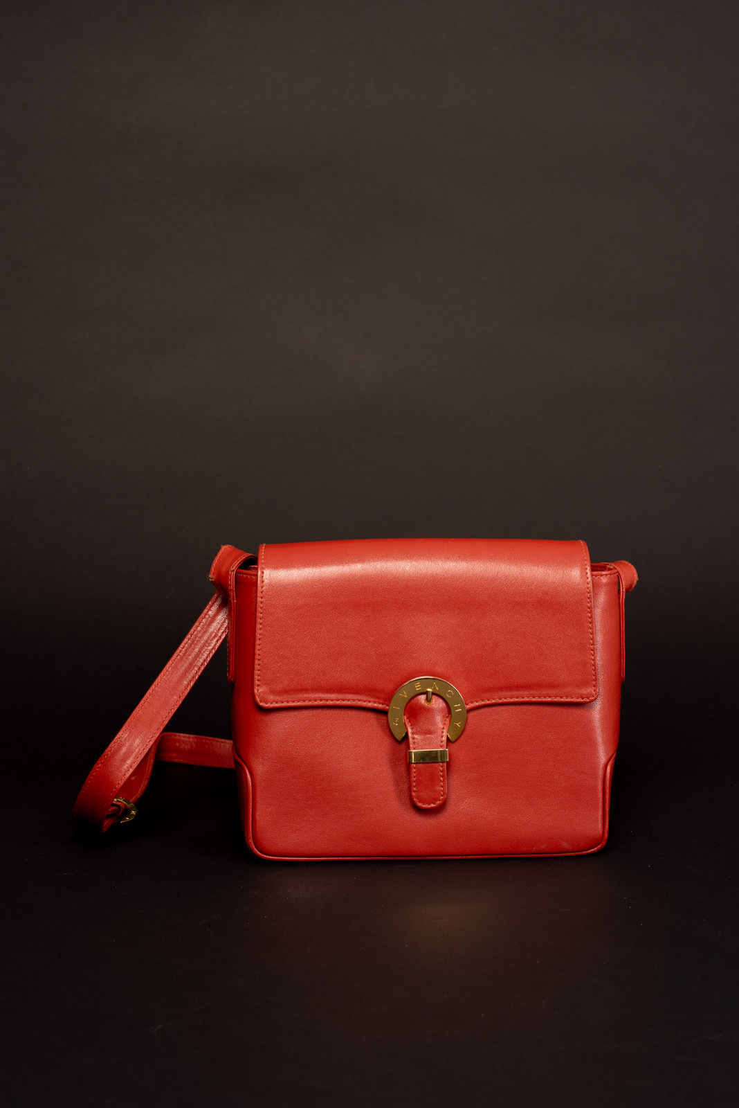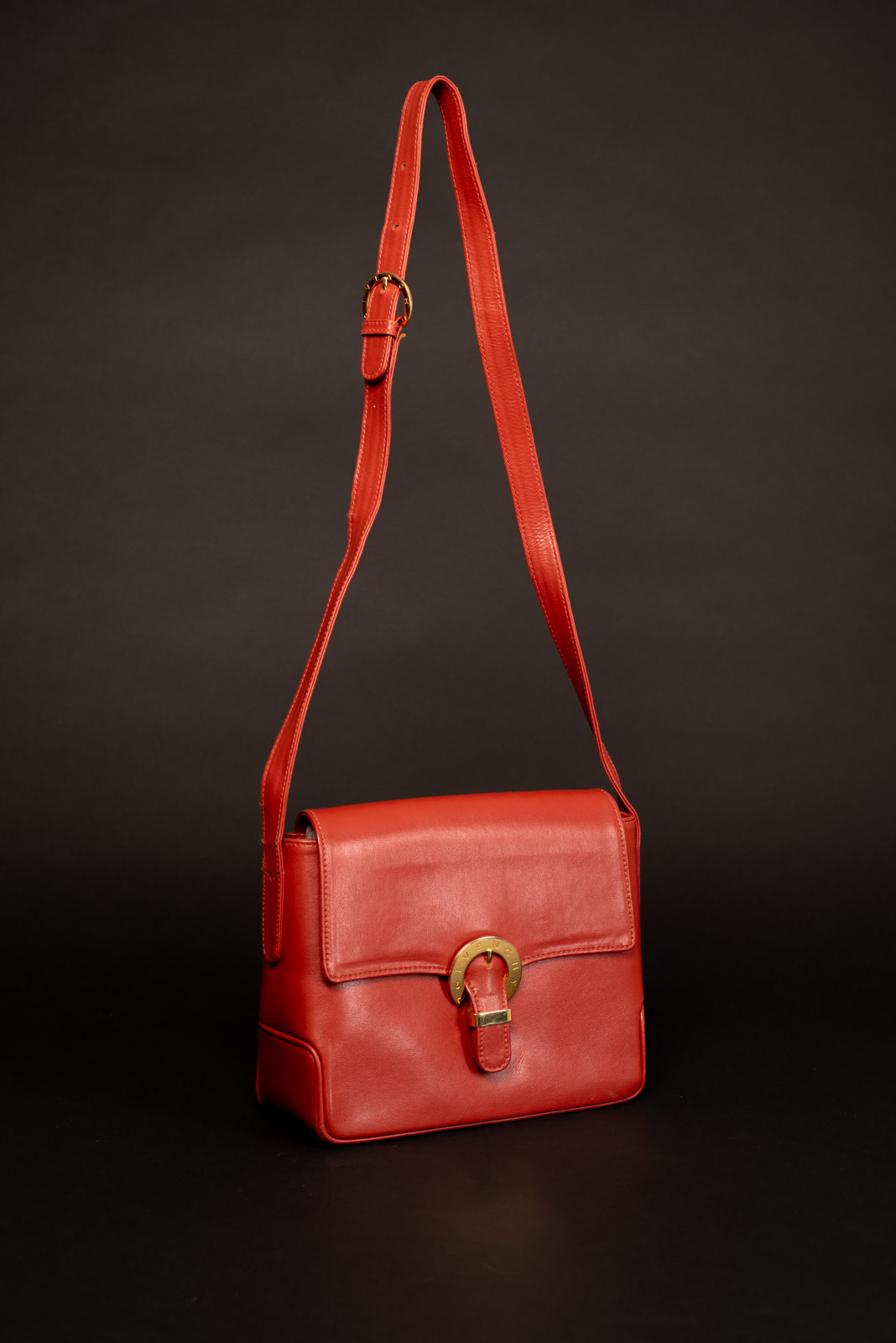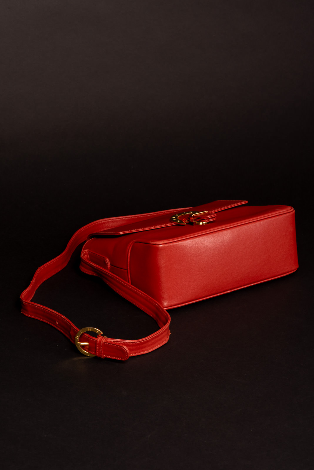 - Golden hardware logo buckle on the front and on the shoulder strap