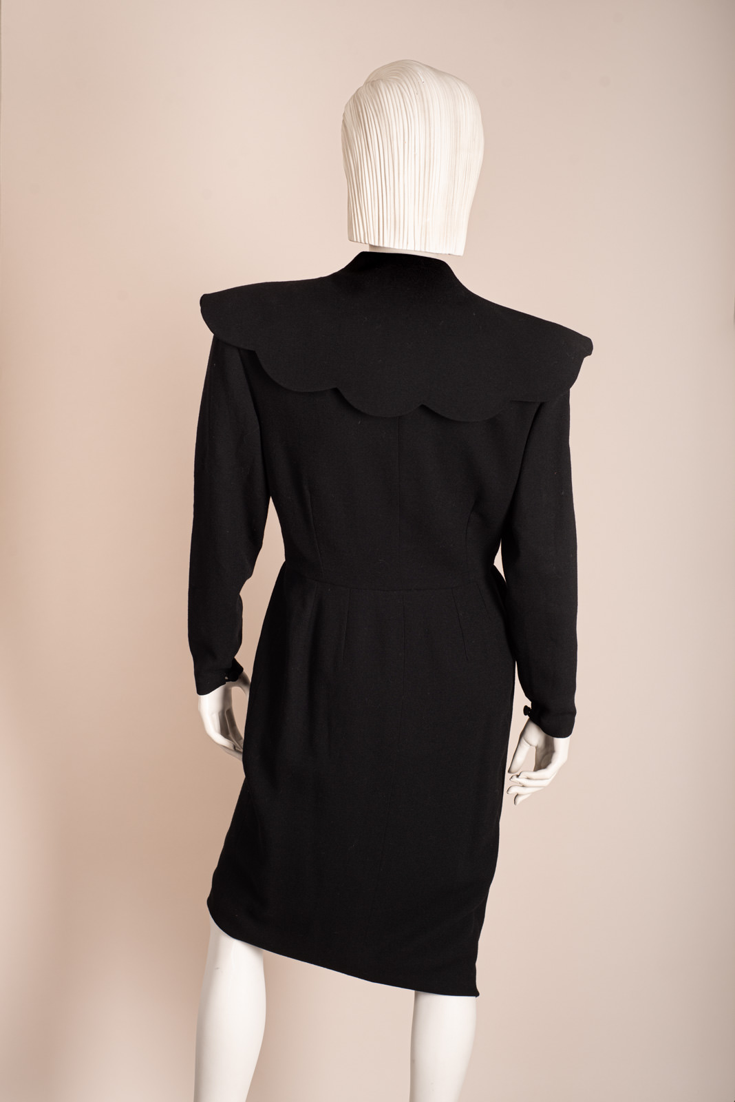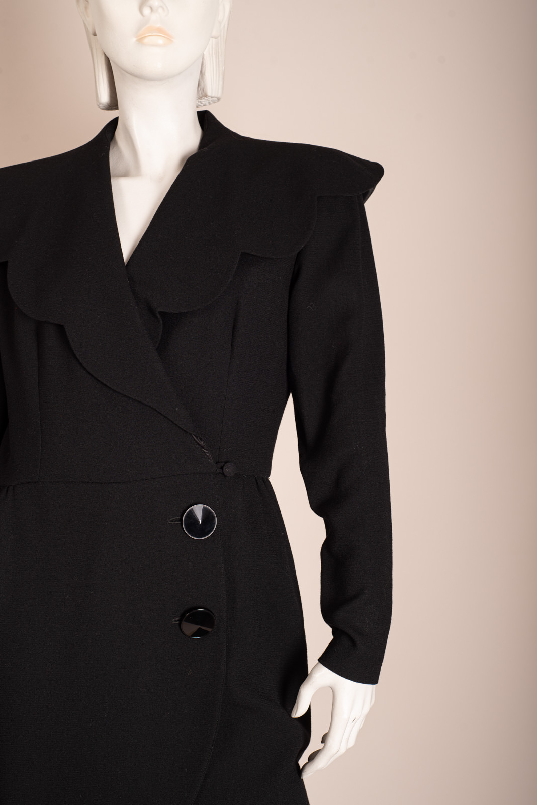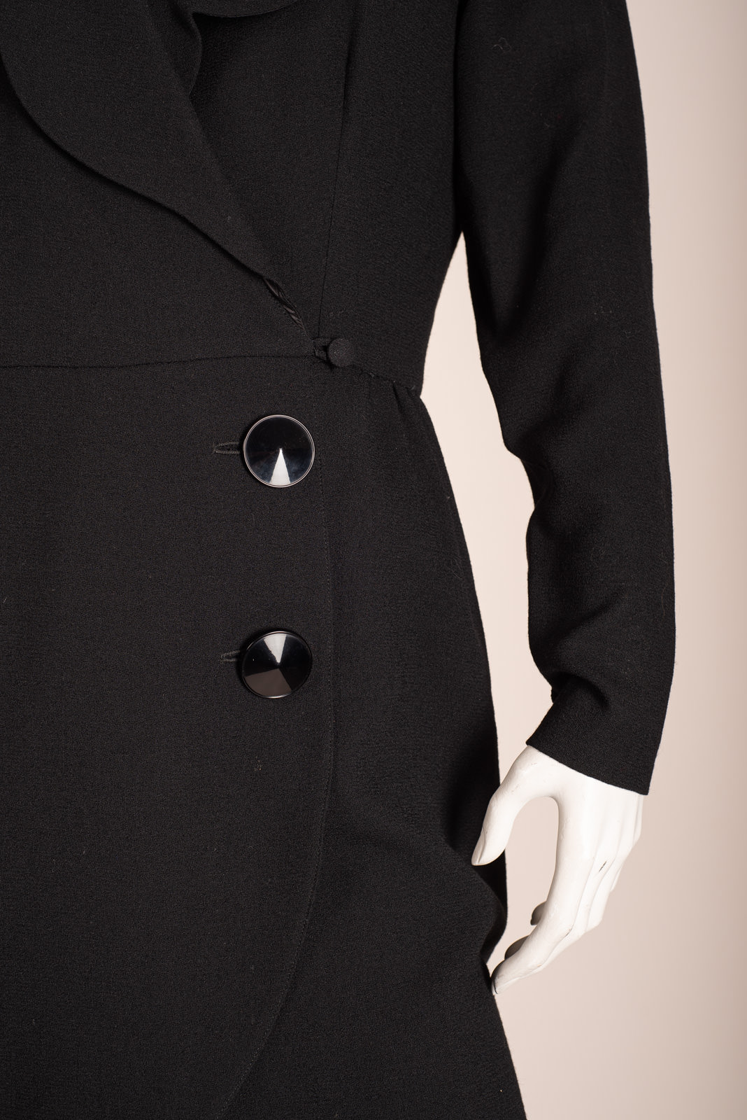 - Long straight sleeves closing with a crepe button