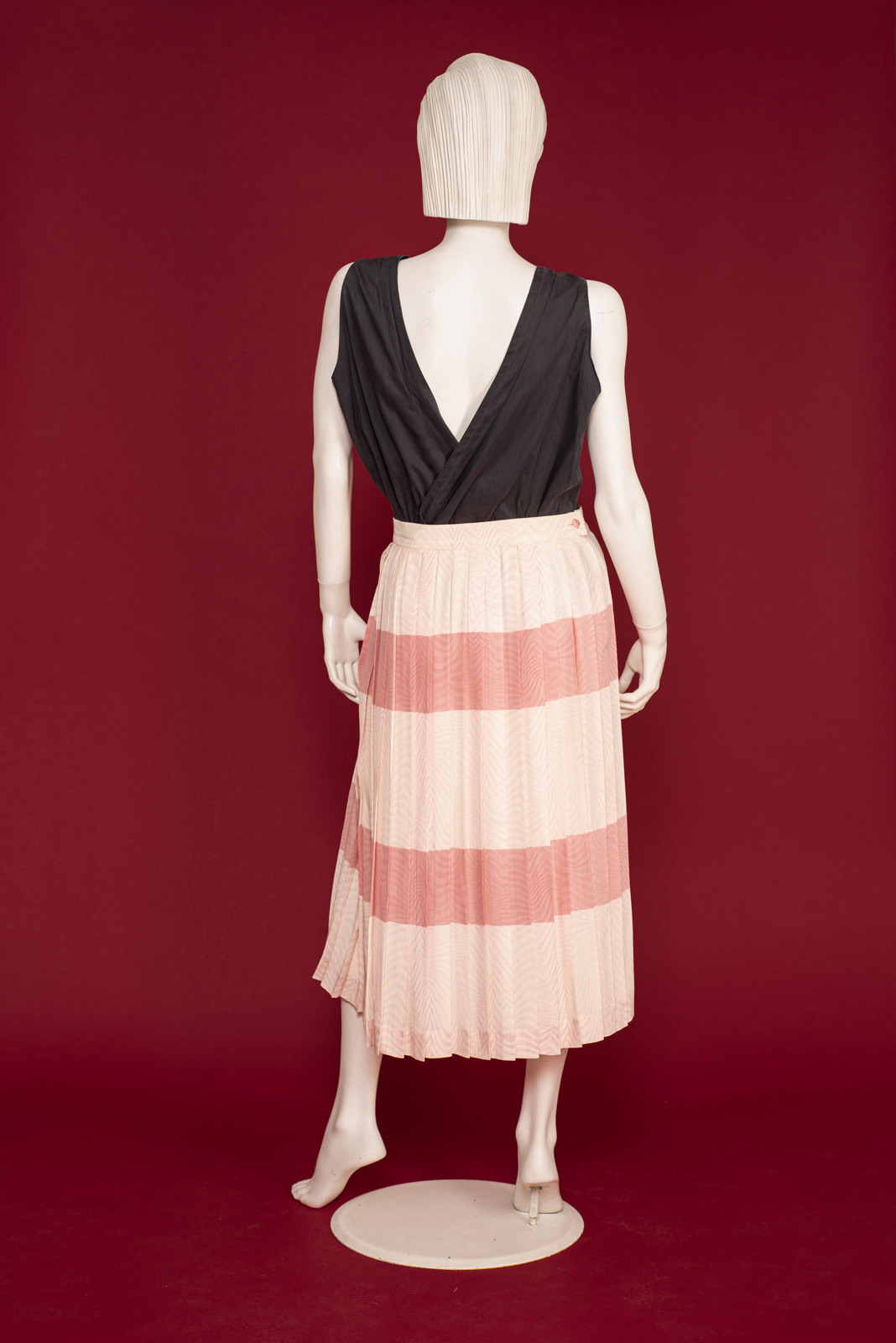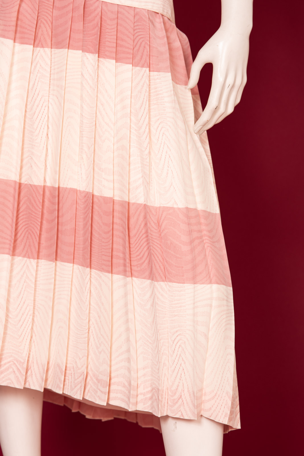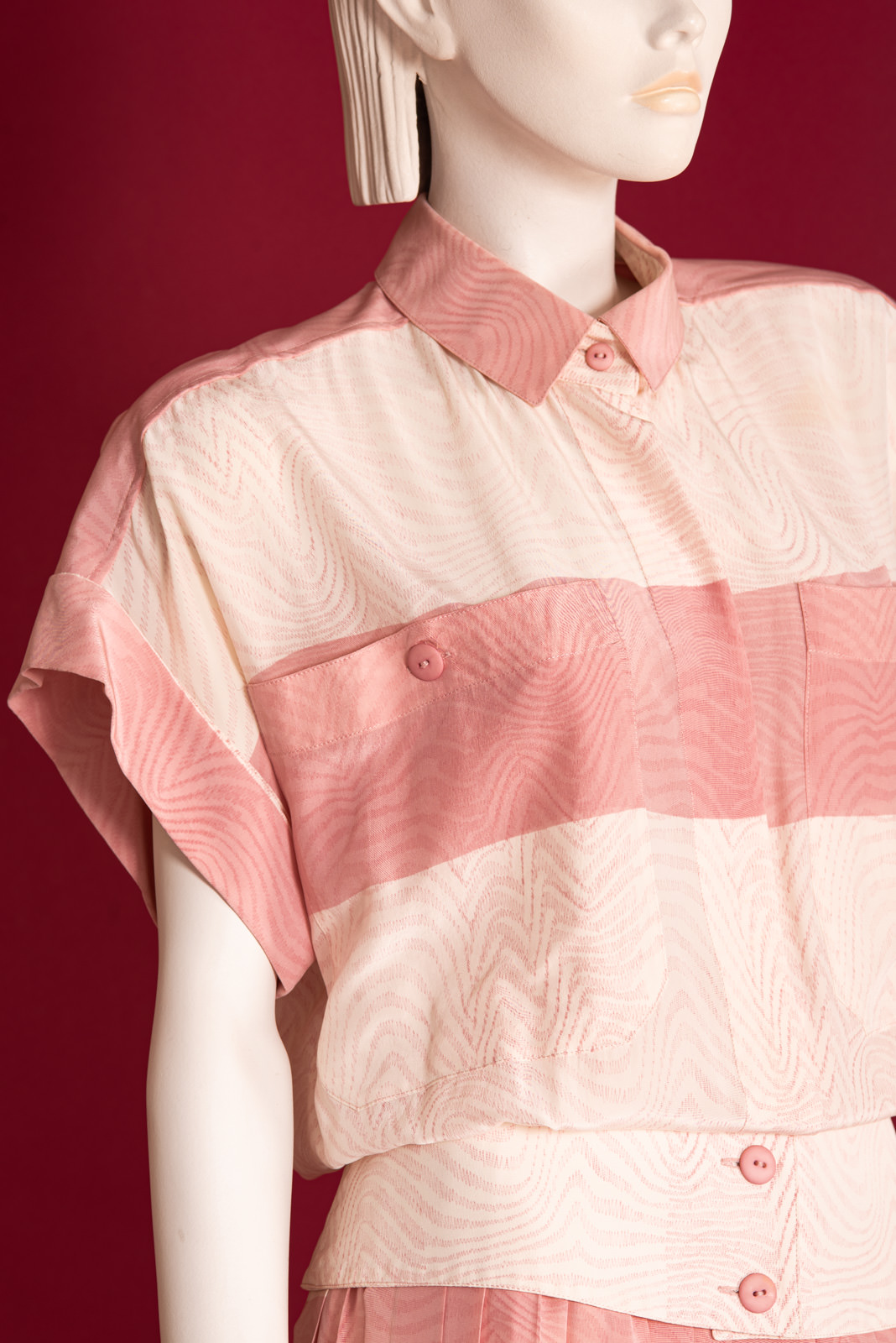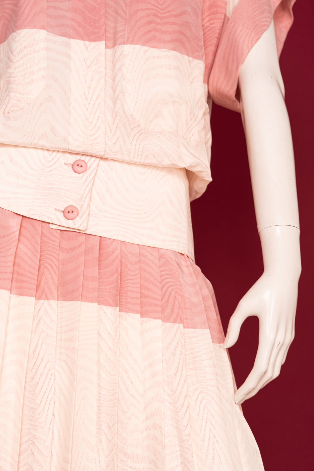 Splendid Louis Feraud striped silk ensemble from the 1980s, crafted in a gorgeous pink camaïeu striped silk fabric, and featuring many lavish details that gives this outfit a perfect and intemporal couture look.