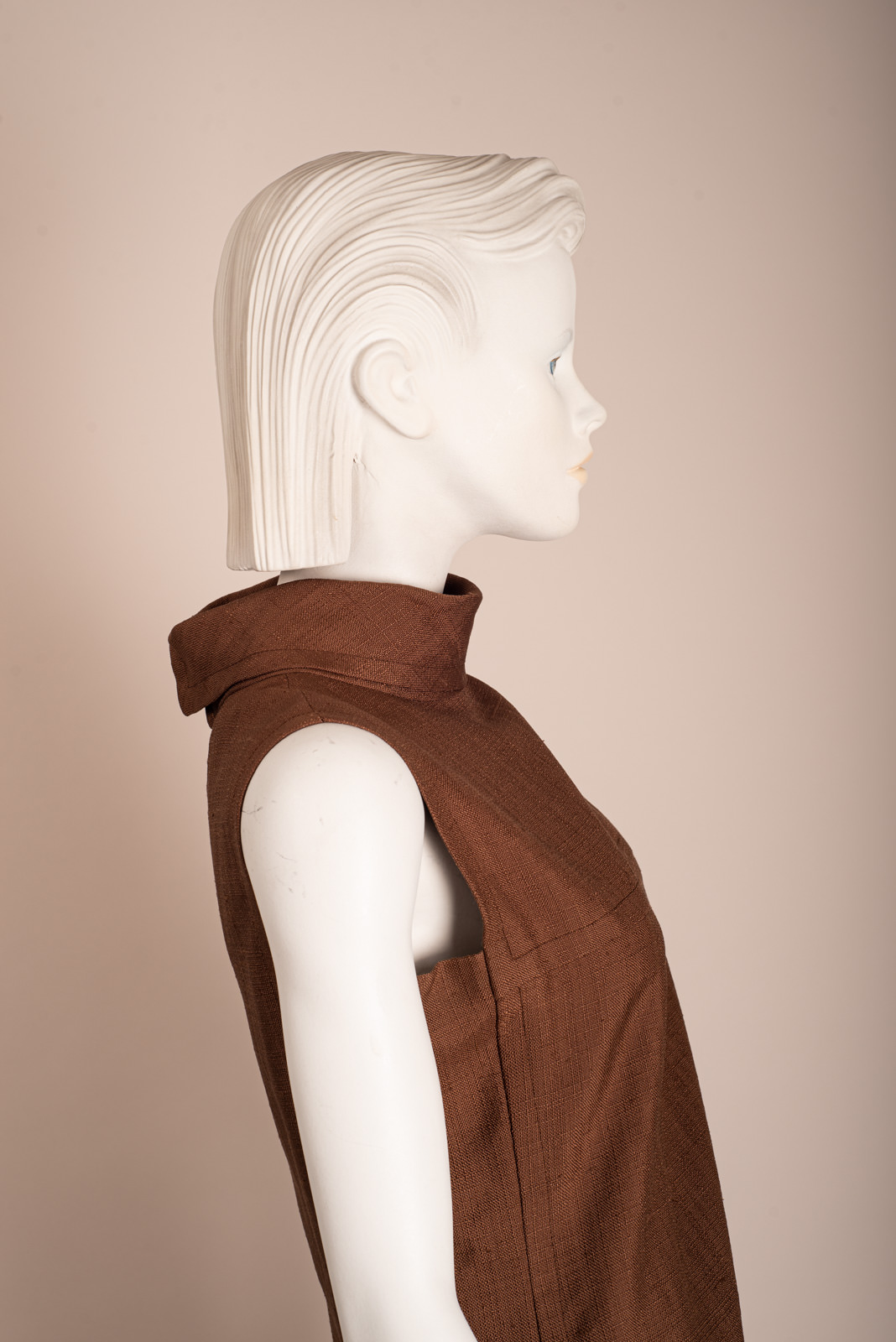 • Sleeveless brown linen dress