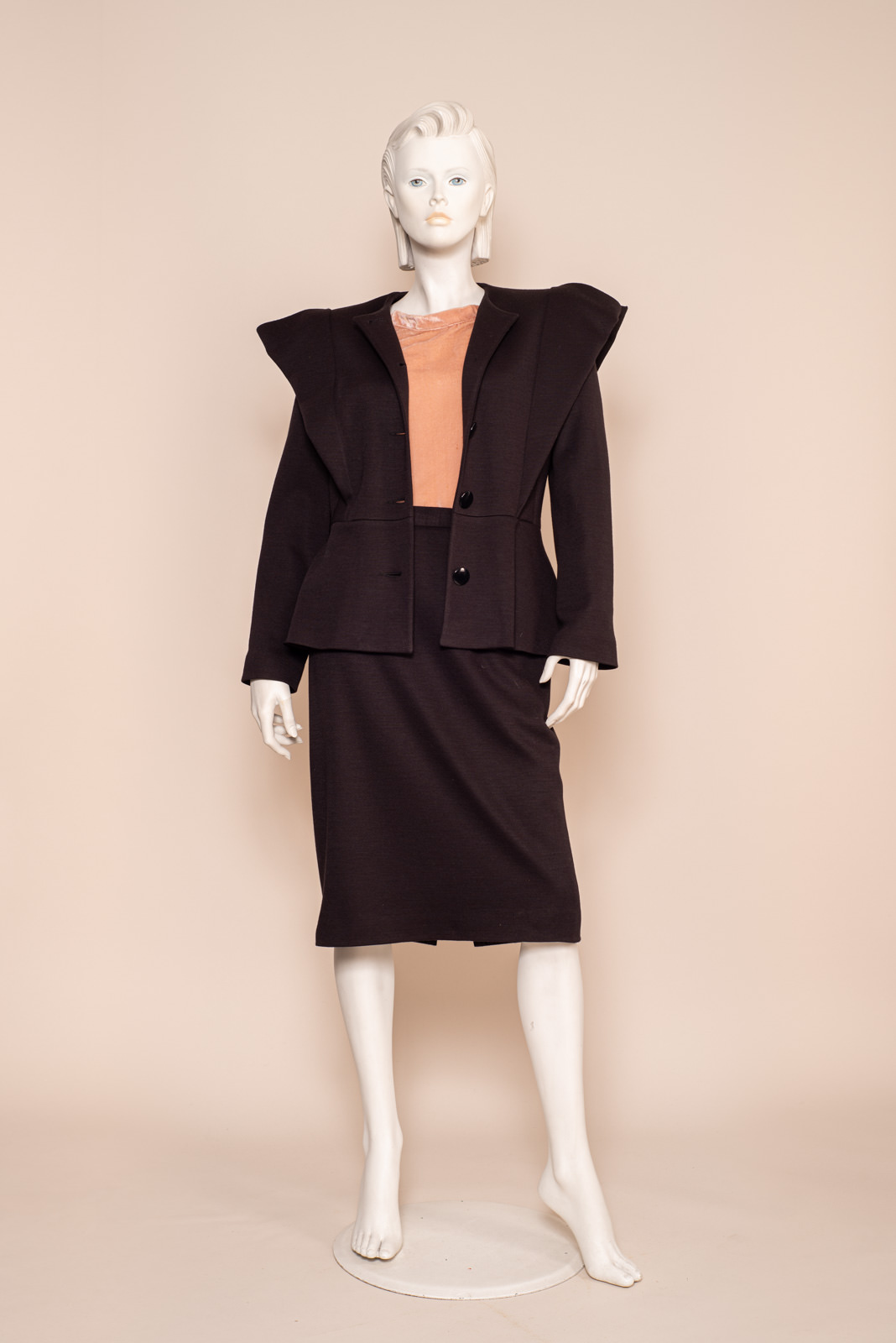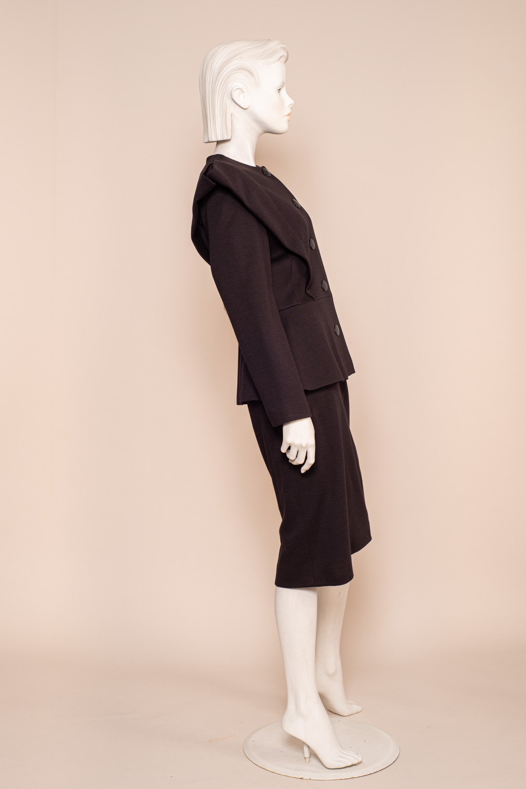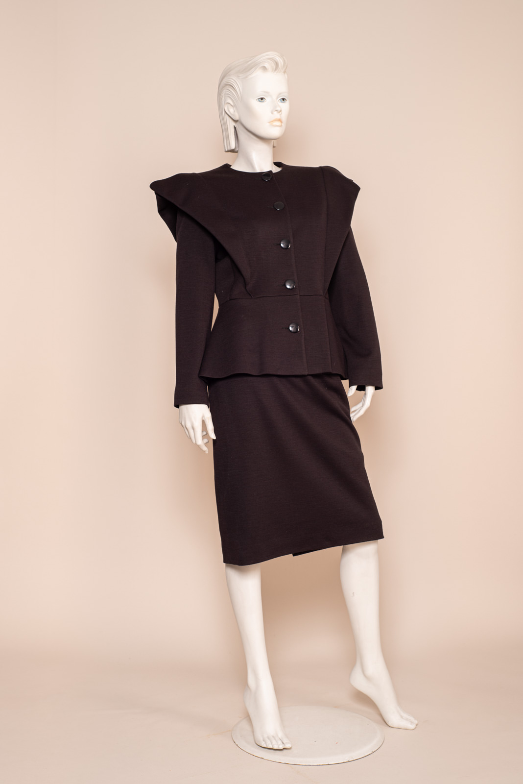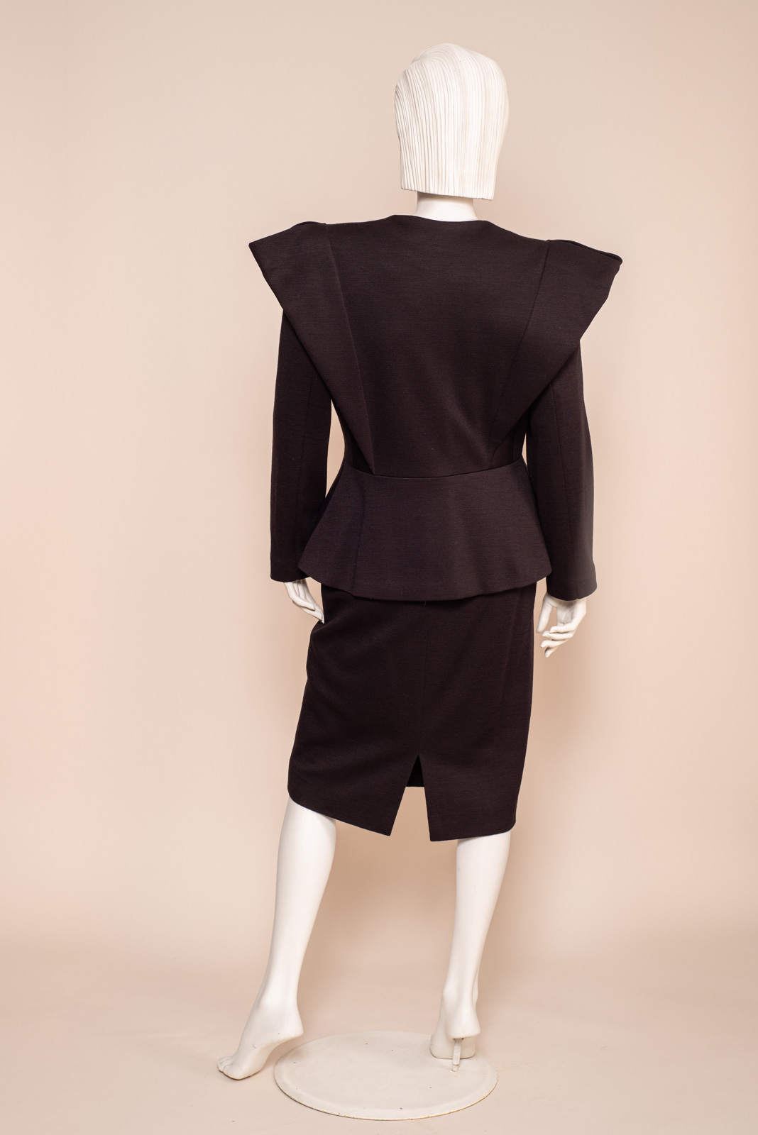 Rare and stunning Pierre Cardin black skirt suit from the 1990s, the killing detail of this fashionable set is the XL structured shoulders that creates a refined yet original volume that highlight the perfect cut of the straight skirt.