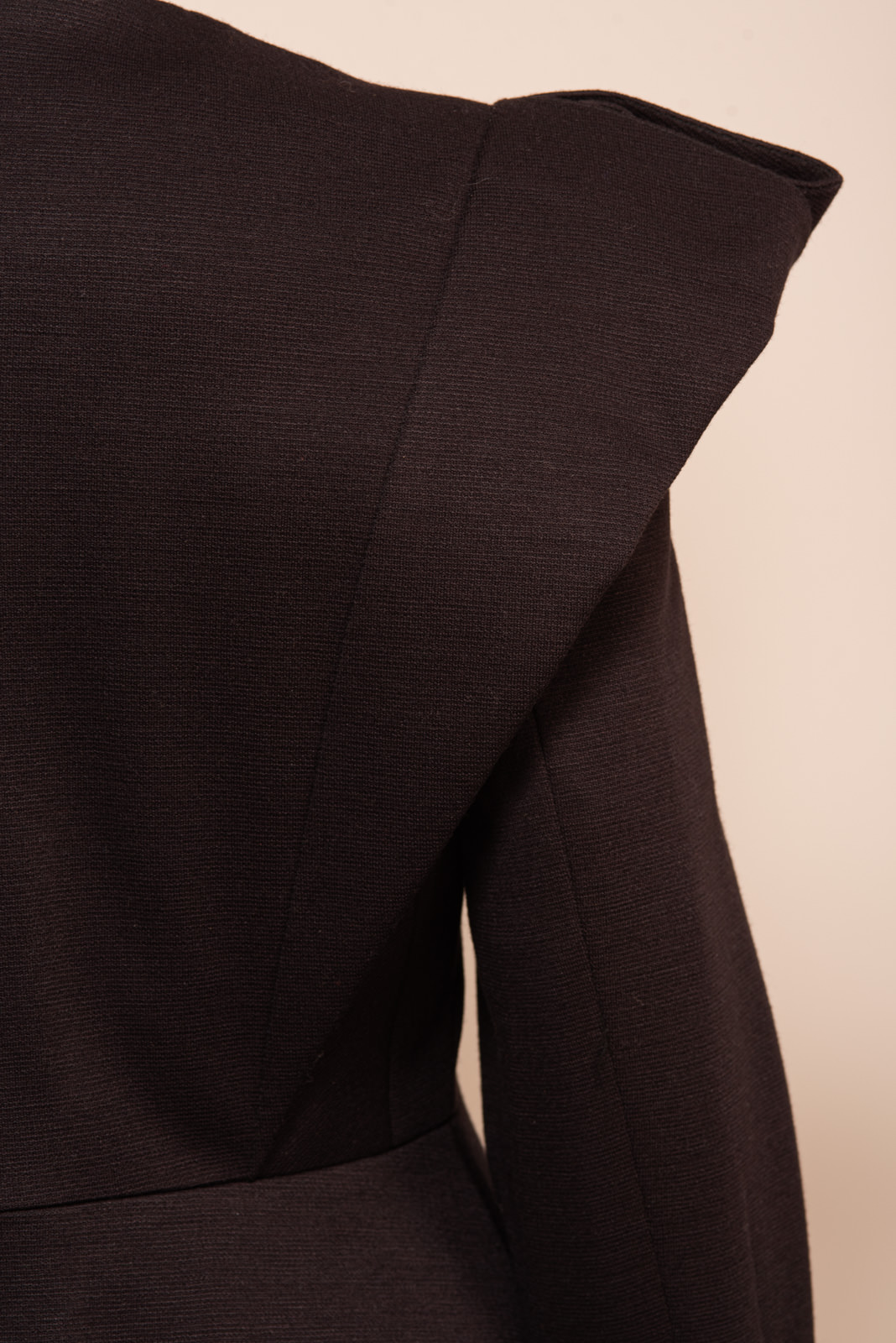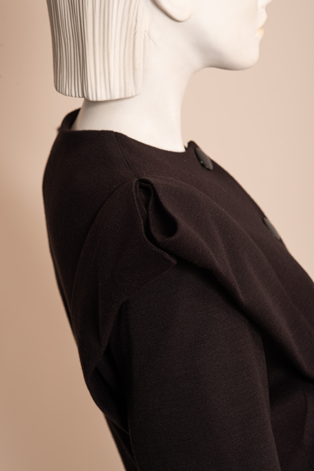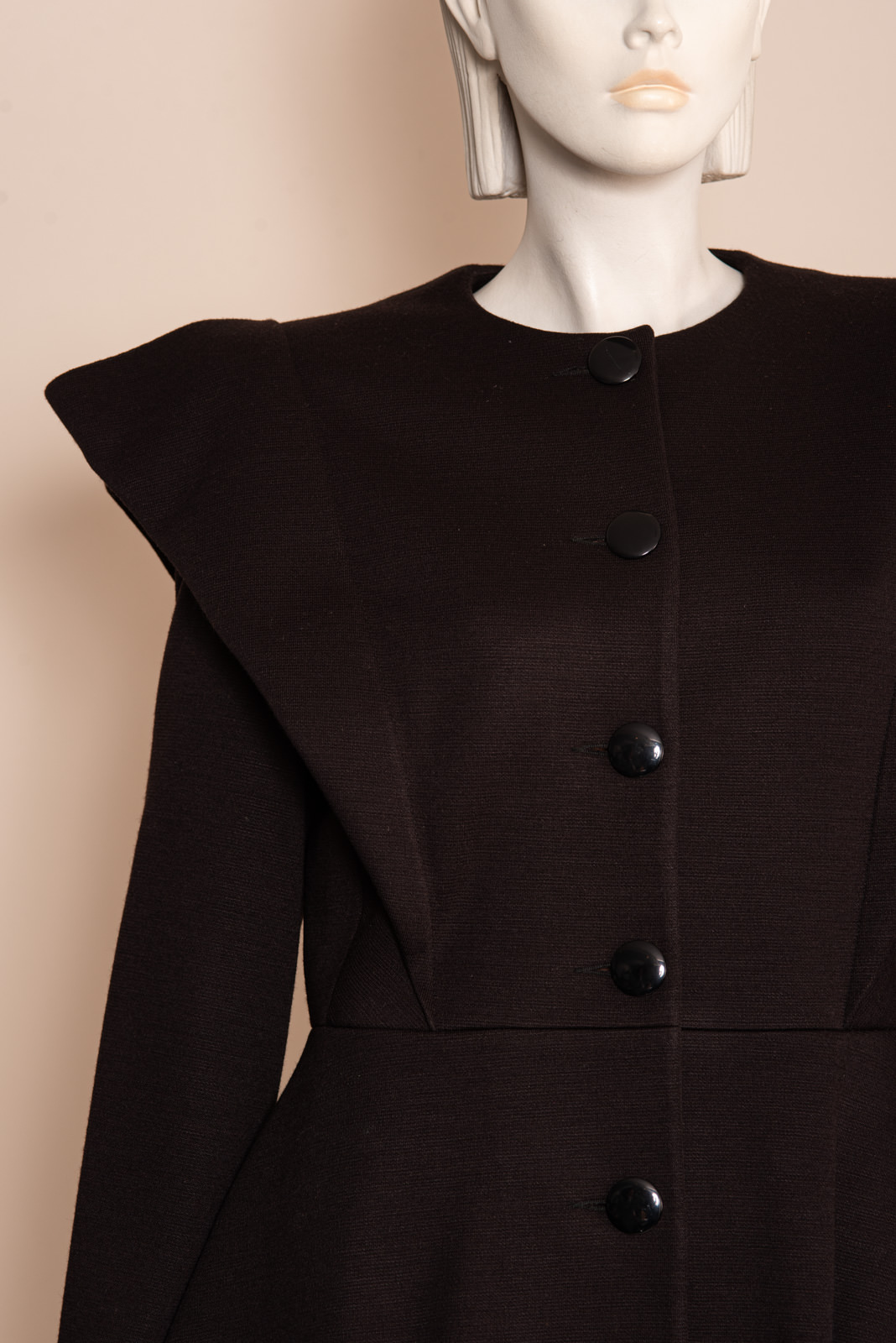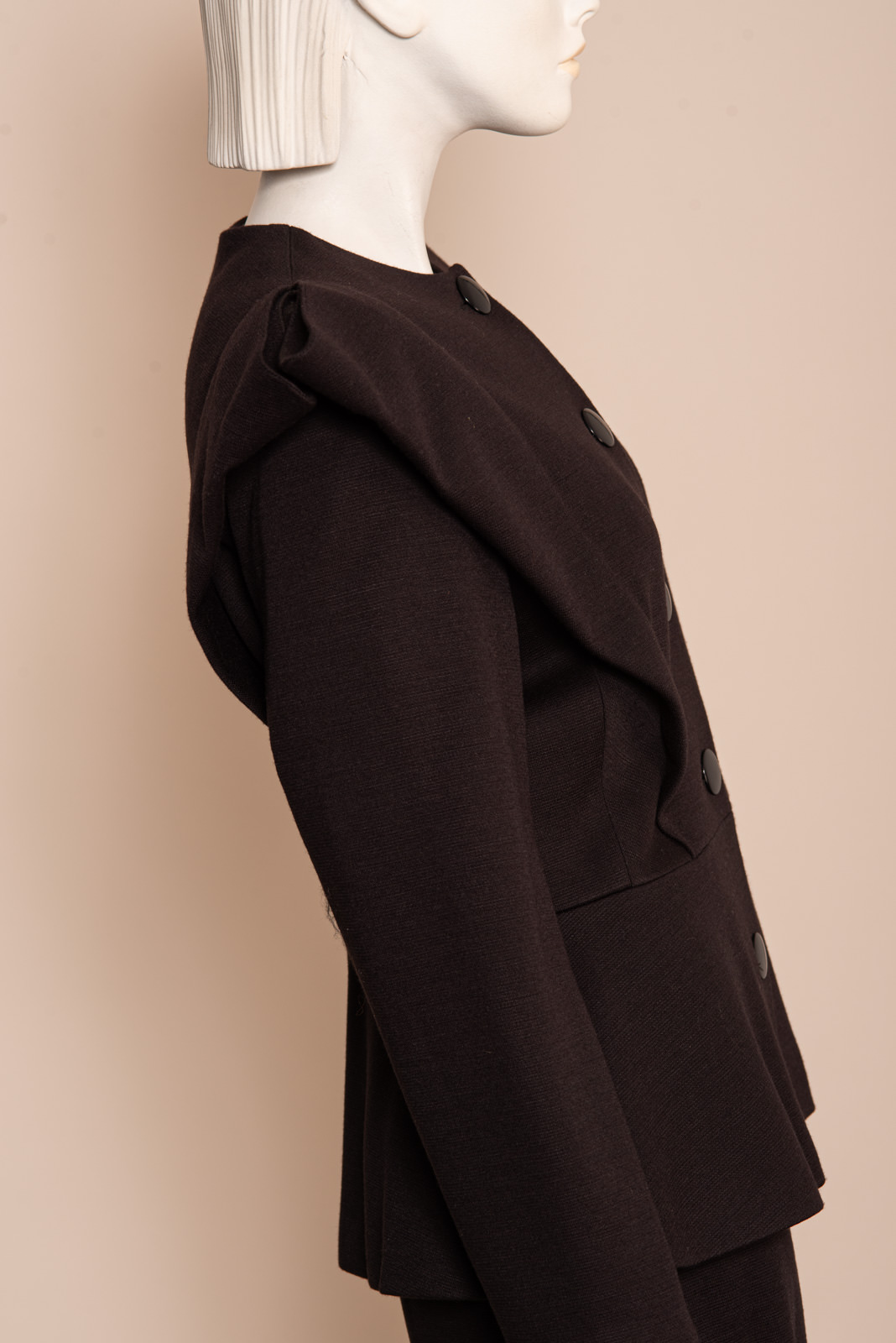 Rare and stunning Pierre Cardin black skirt suit from the 1990s, the killing detail of this fashionable set is the XL structured shoulders that creates a refined yet original volume that highlight the perfect cut of the straight skirt.