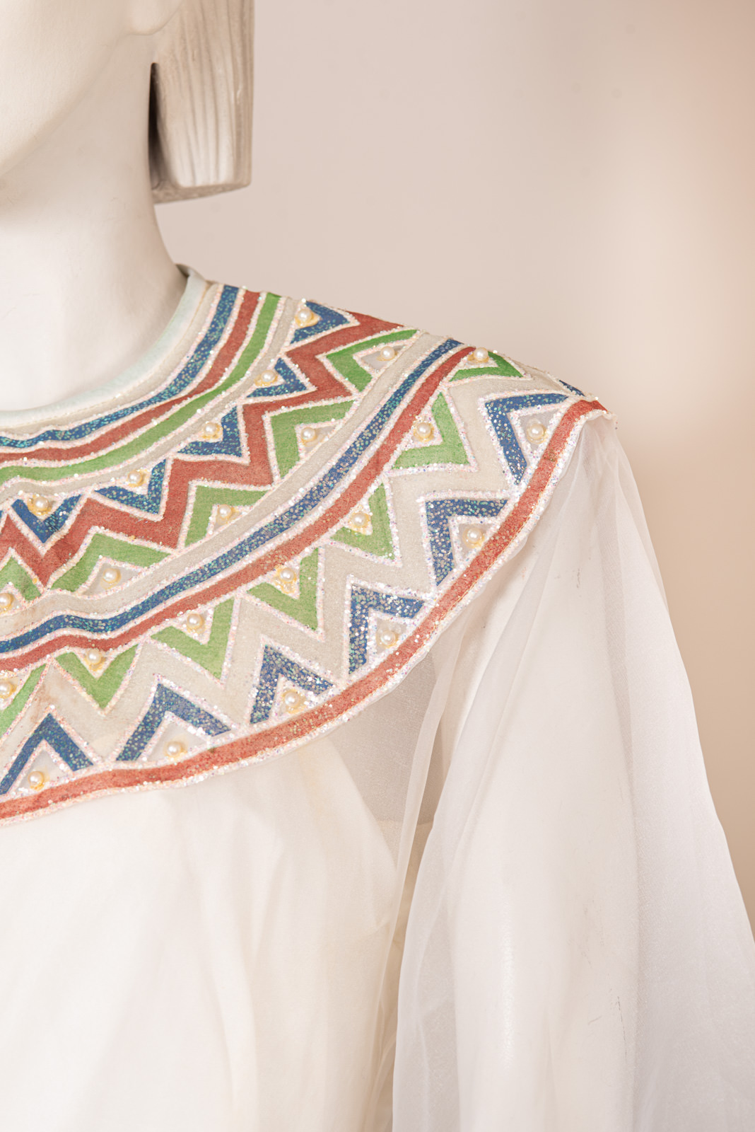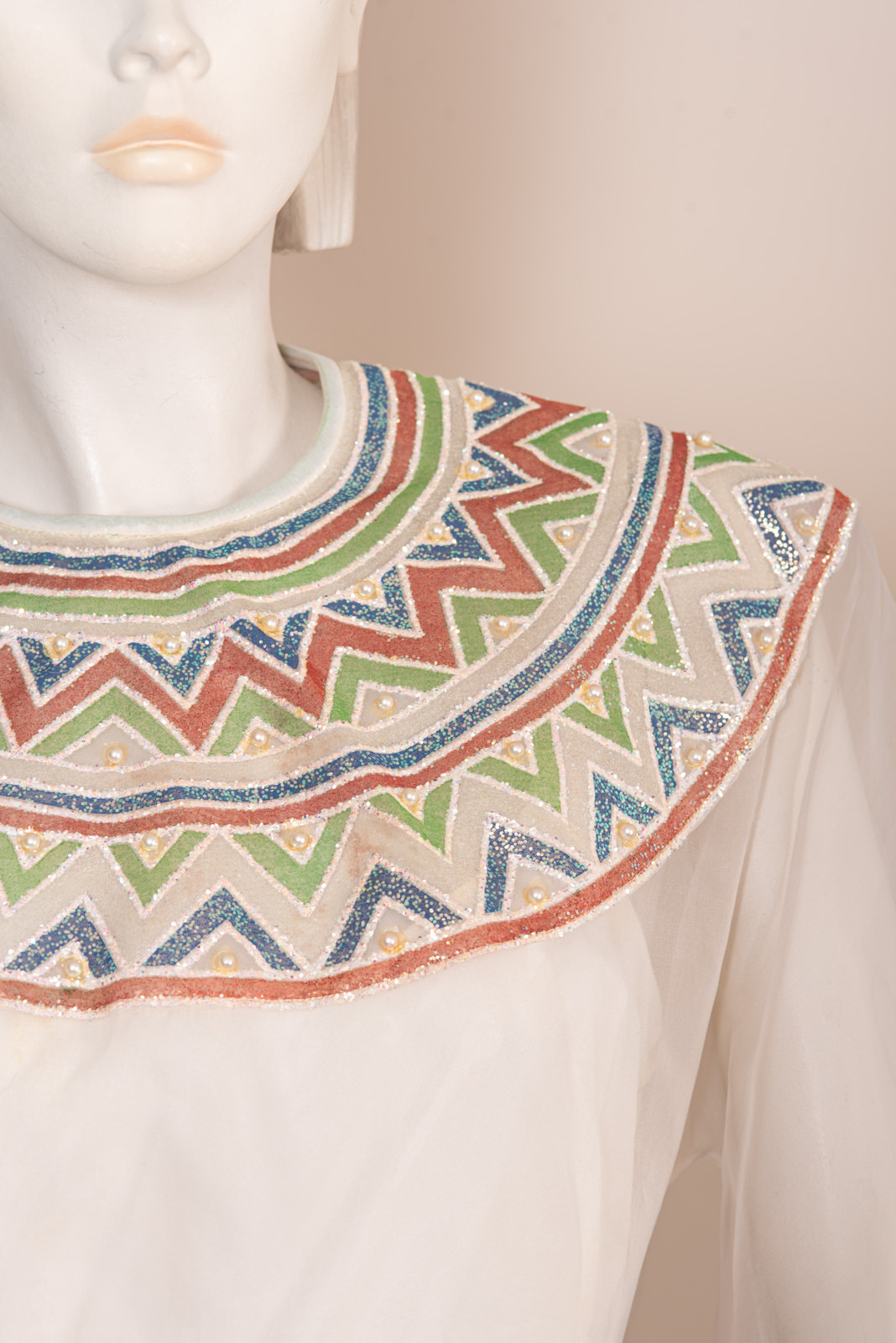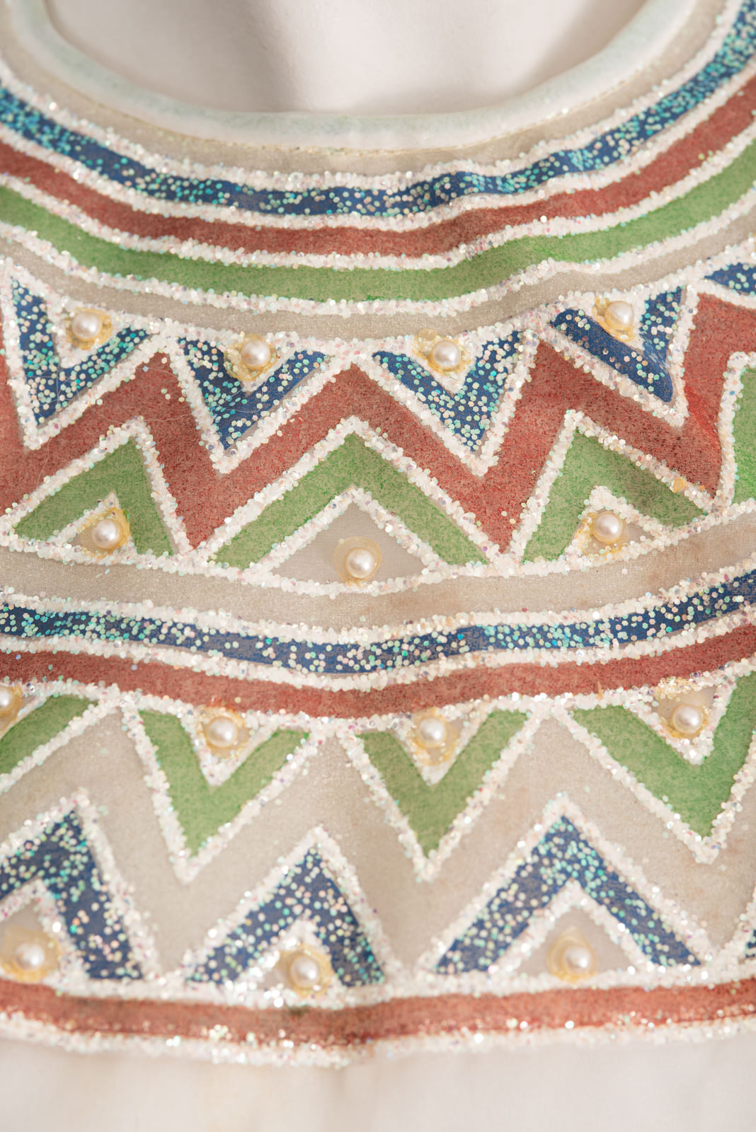 - Iridescent embroidered bib with multicolor glitter round and geometrics pattern, and nacre pearls