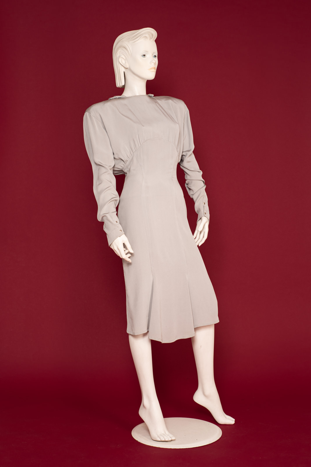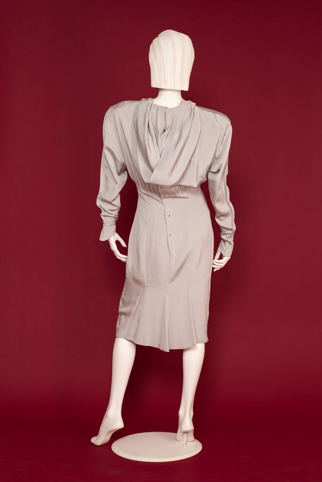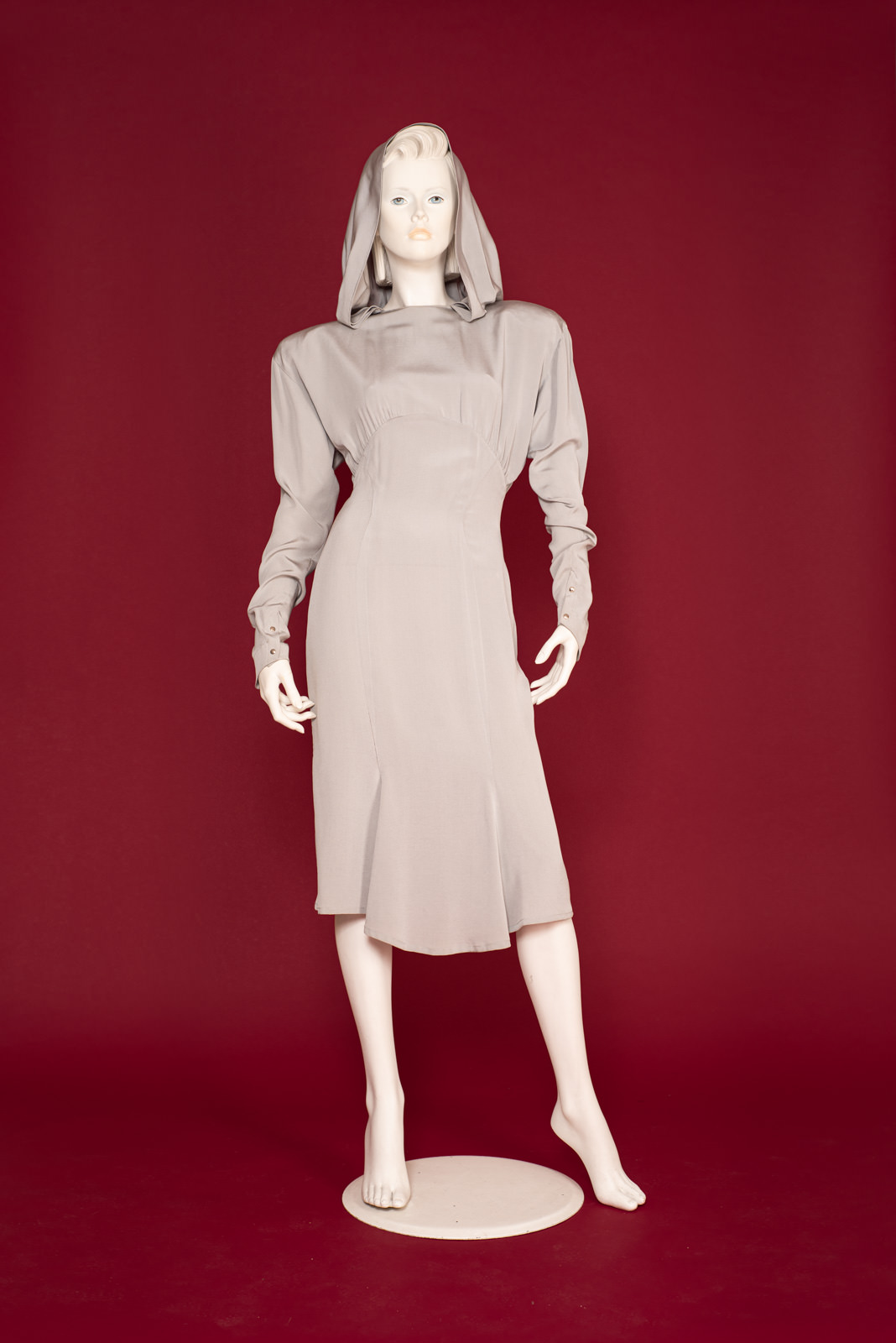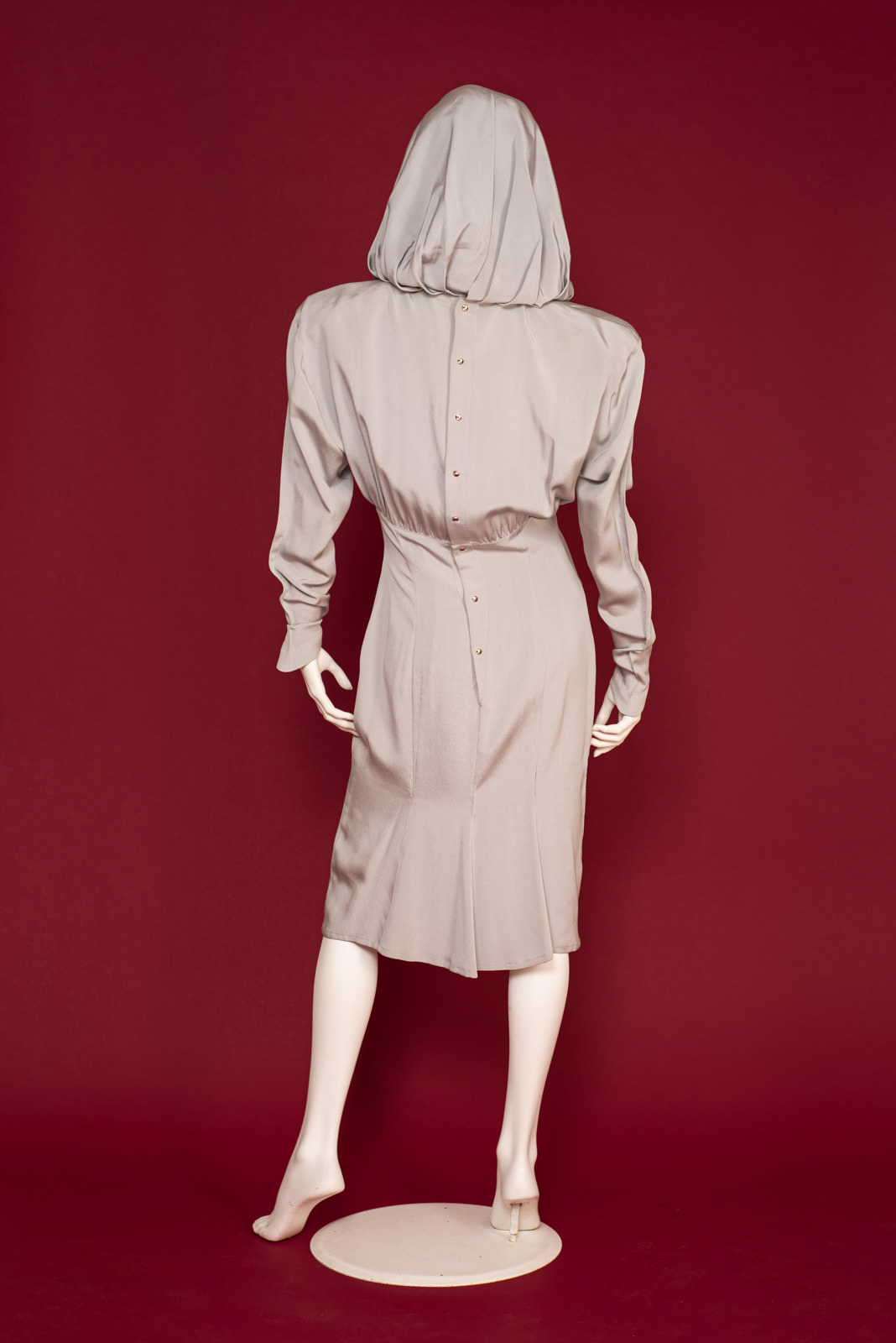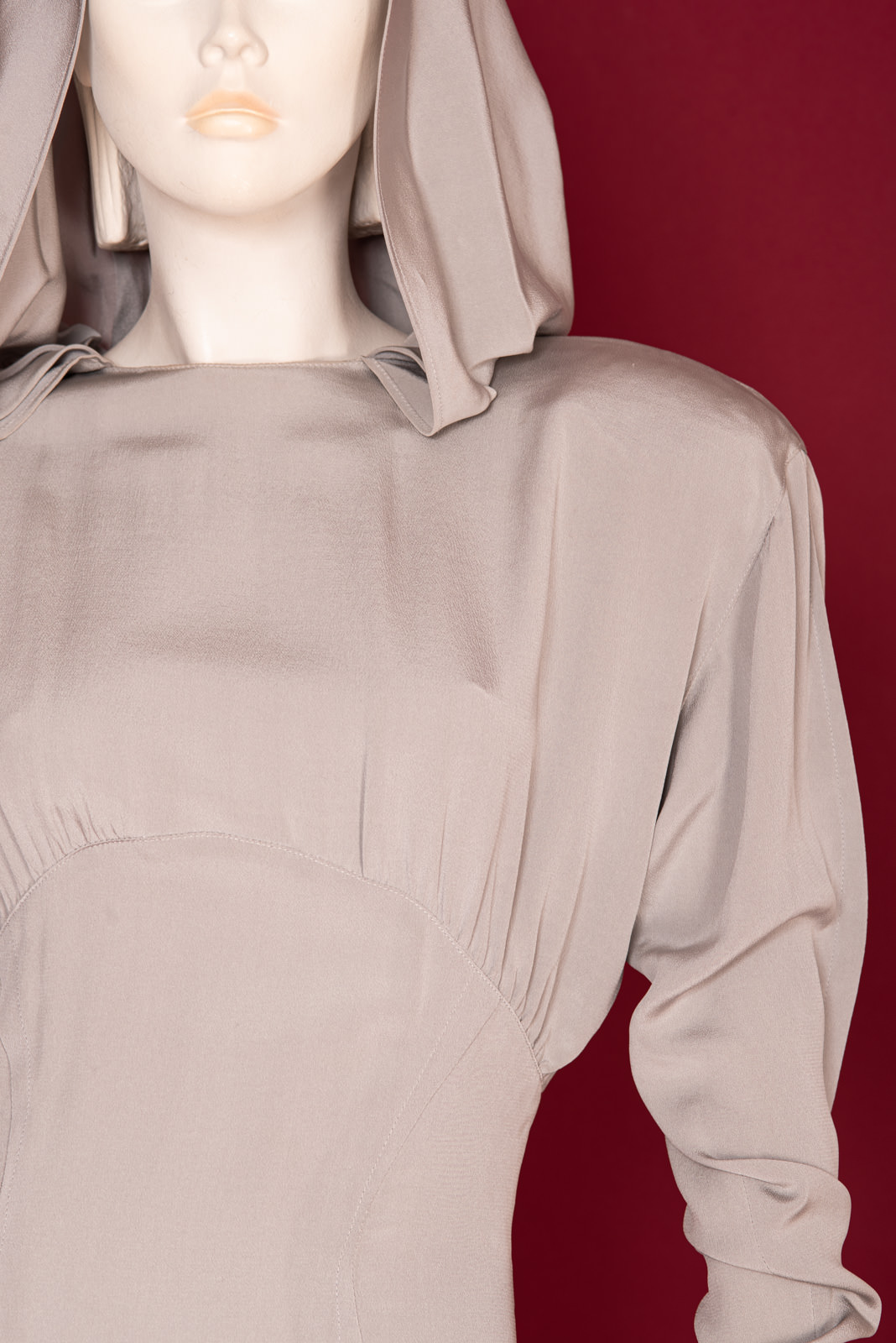 Sexy, Glamorous Thierry Mugler Grey silk sheath dress from the 1980s, with a gorgeous hood at the back and a stunning structured cut, iconic from the House.