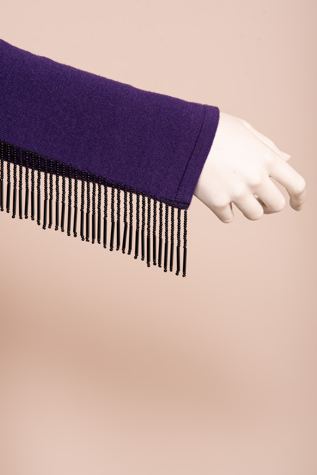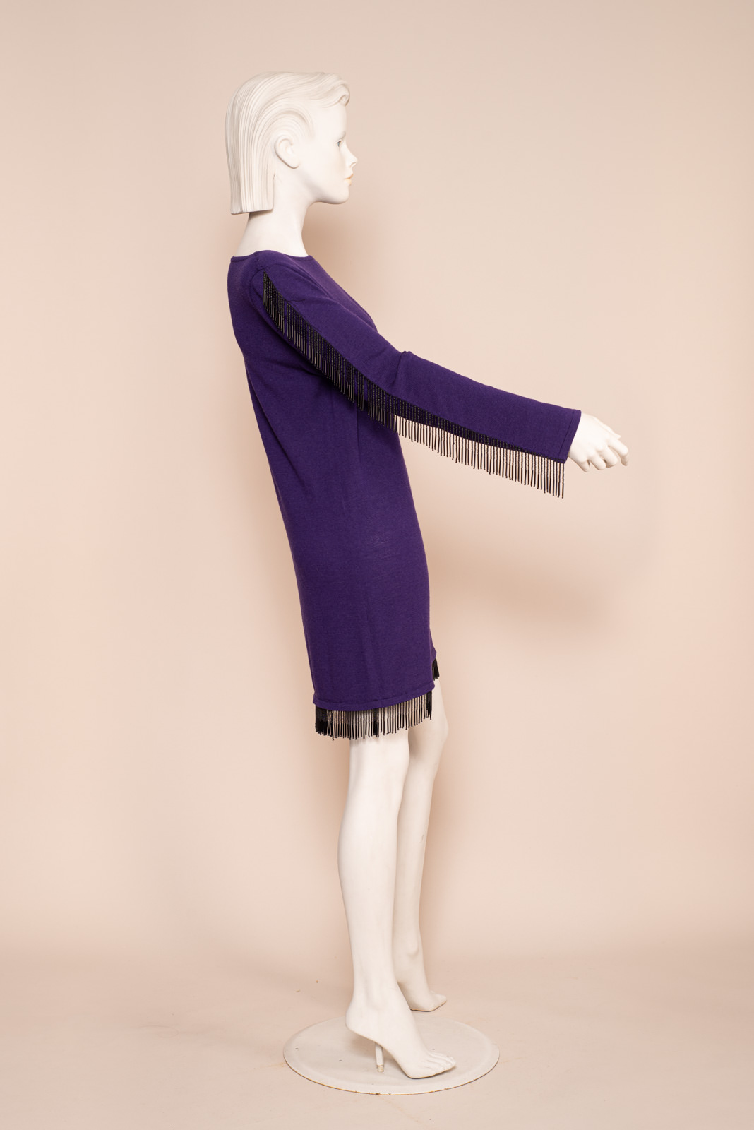 - Gorgeous black pearl fringes all along the sleeves and bottom of the dress
