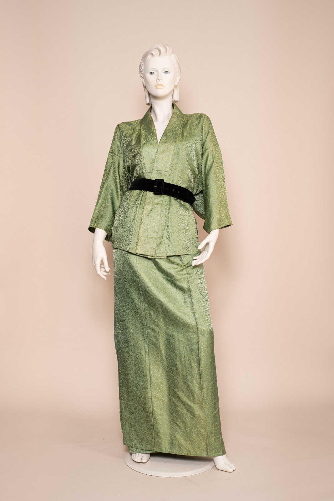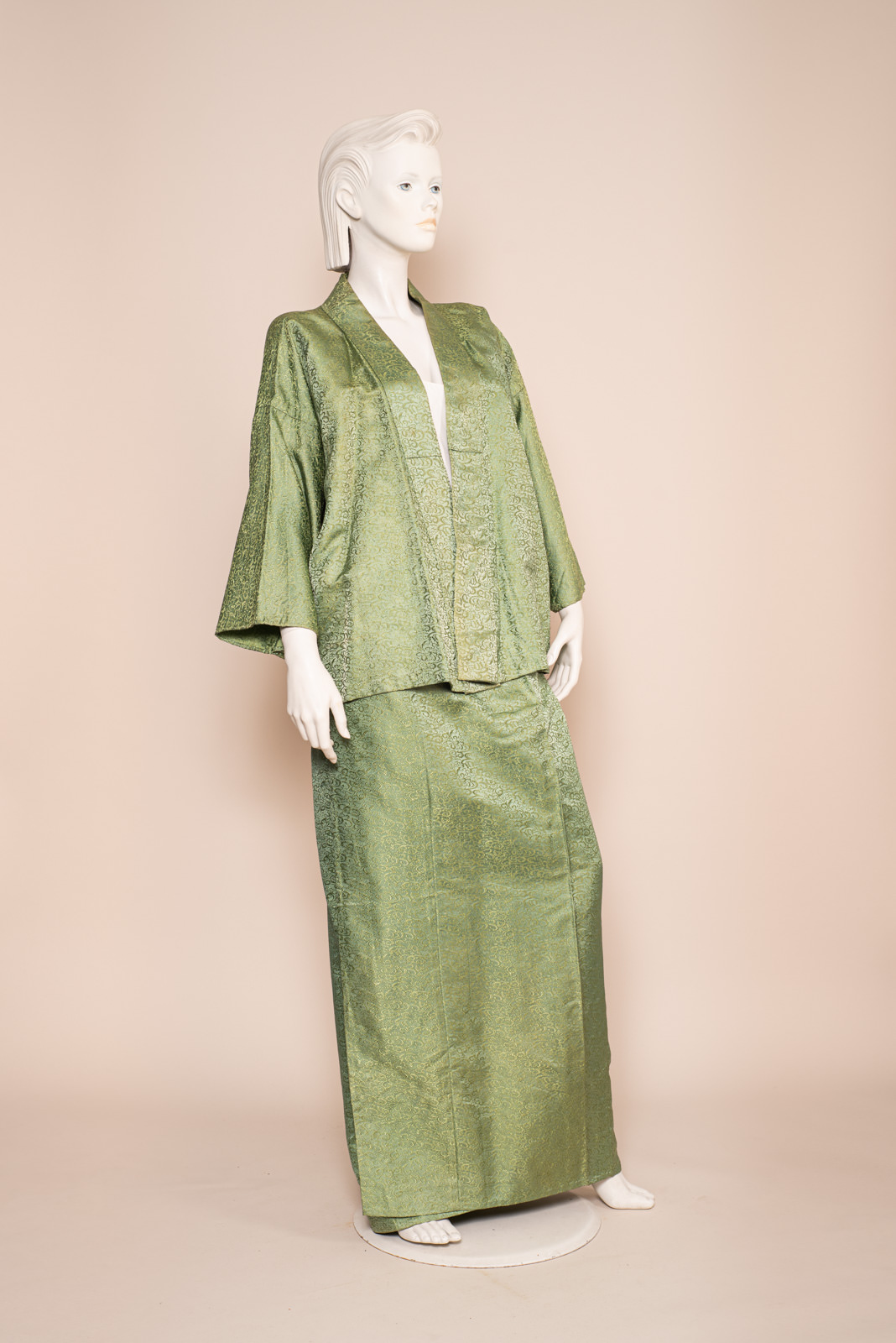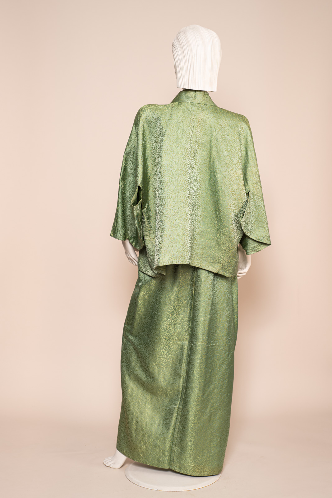 1950s SILK DAMASK GREEN KIMONO SKIRT ENSEMBLE