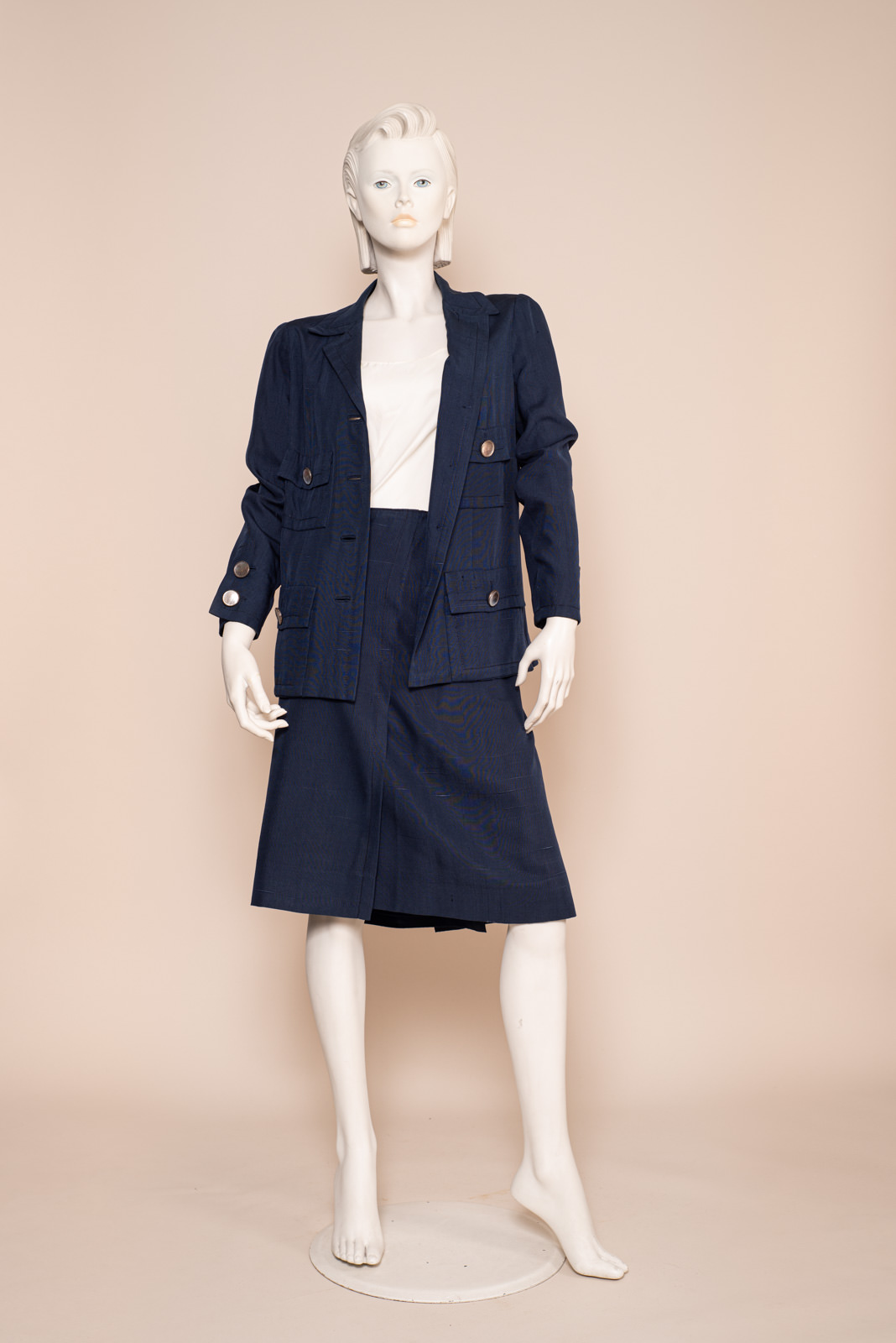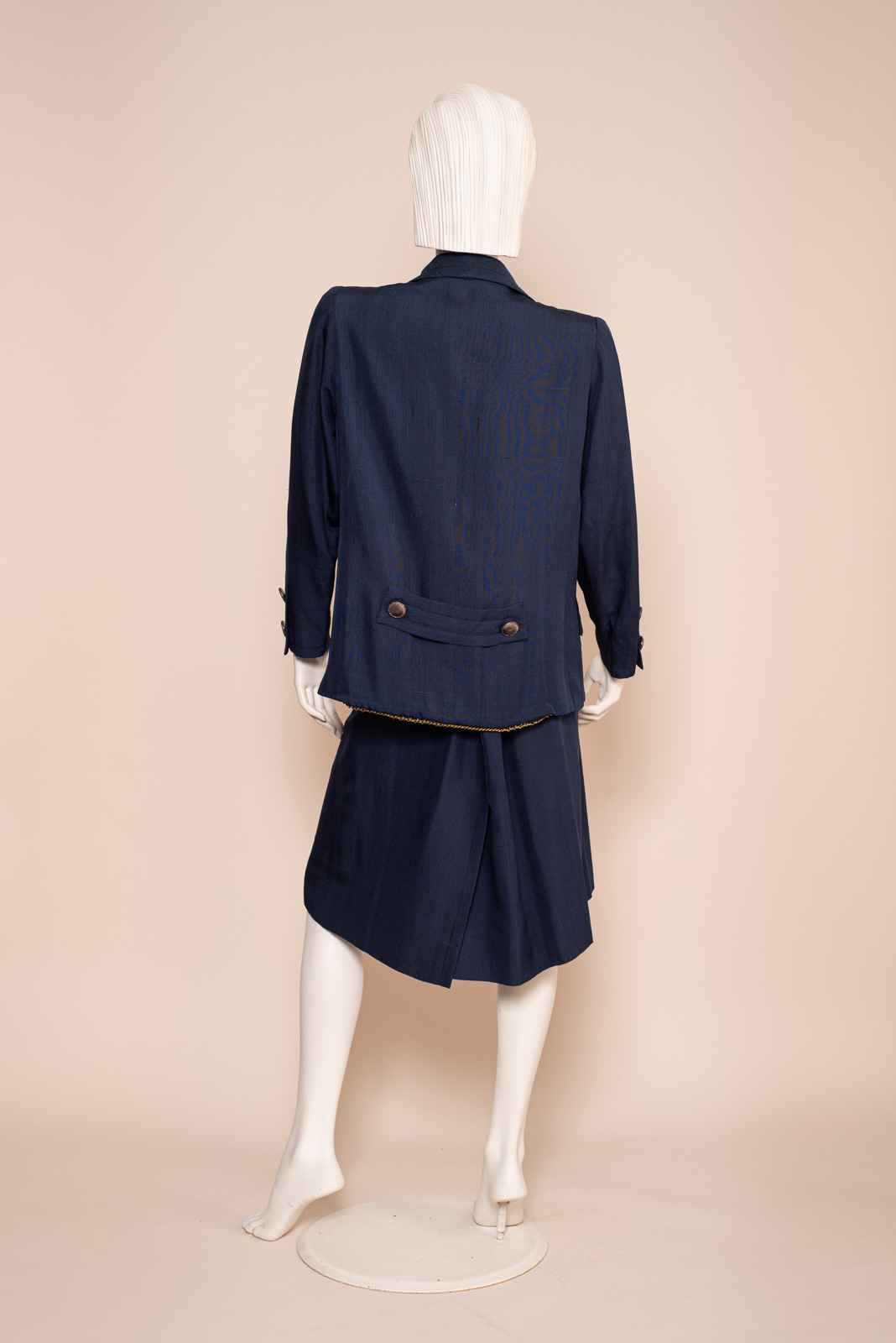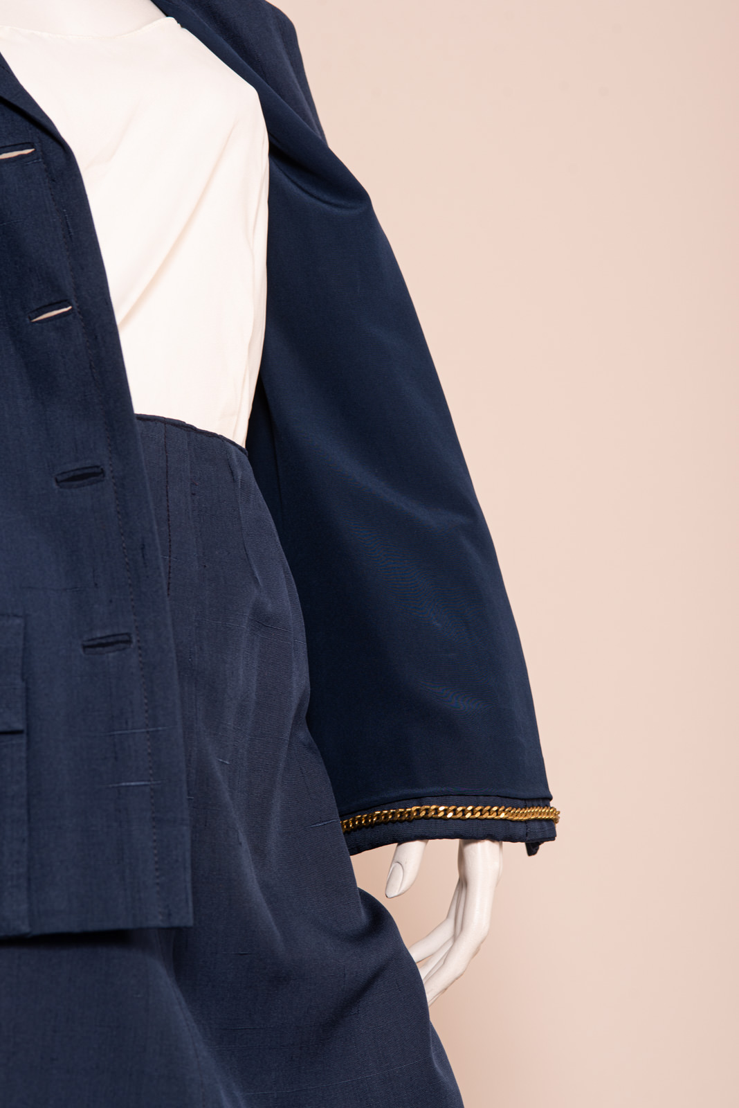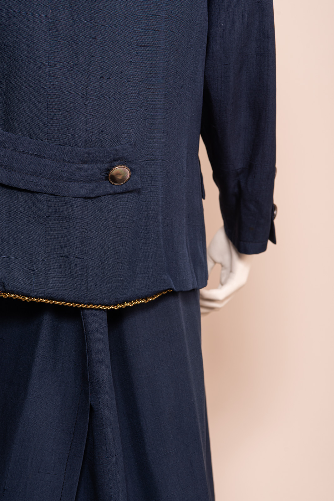 - Haute couture handsewn Chanel style navy wild silk ensemble