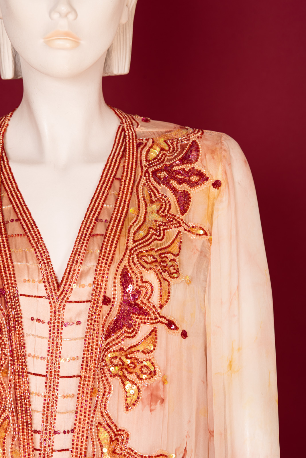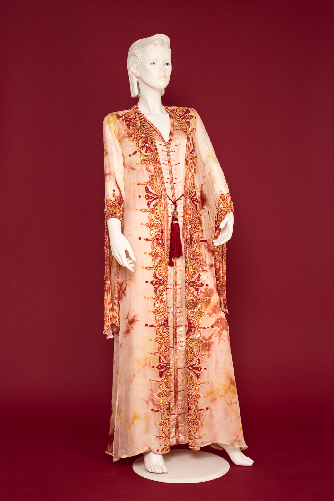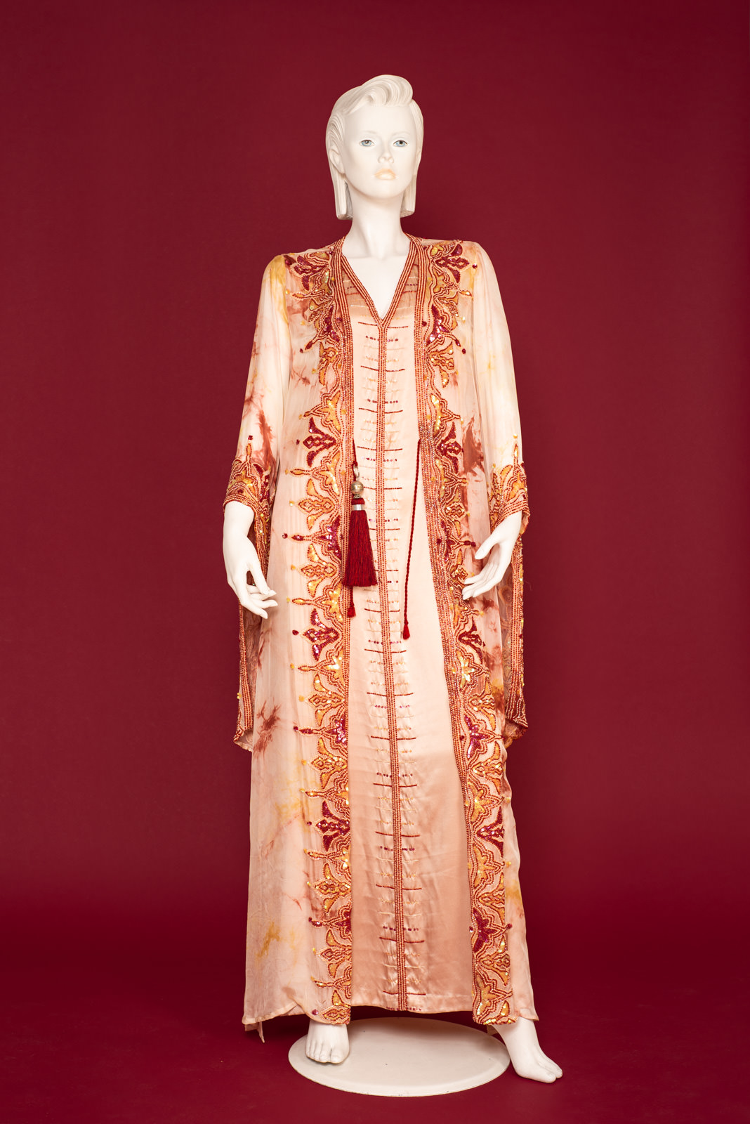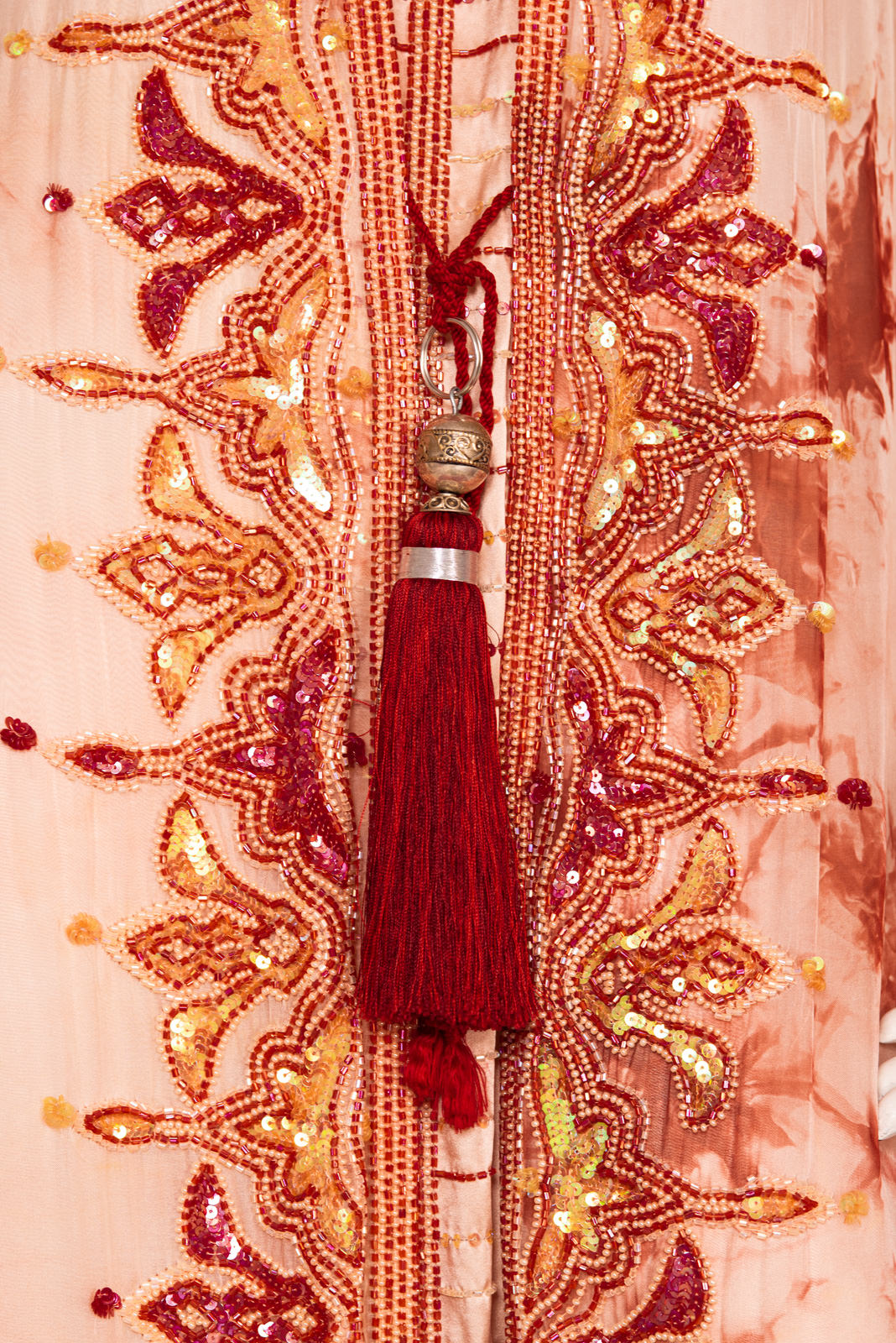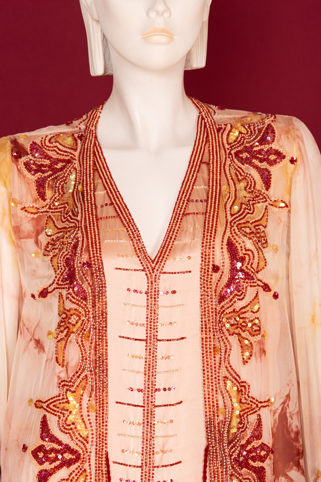 - Richly beaded all along the front folds borders, collar, back collar and on the cuffs with beads forming stylized traditional oriental patterns