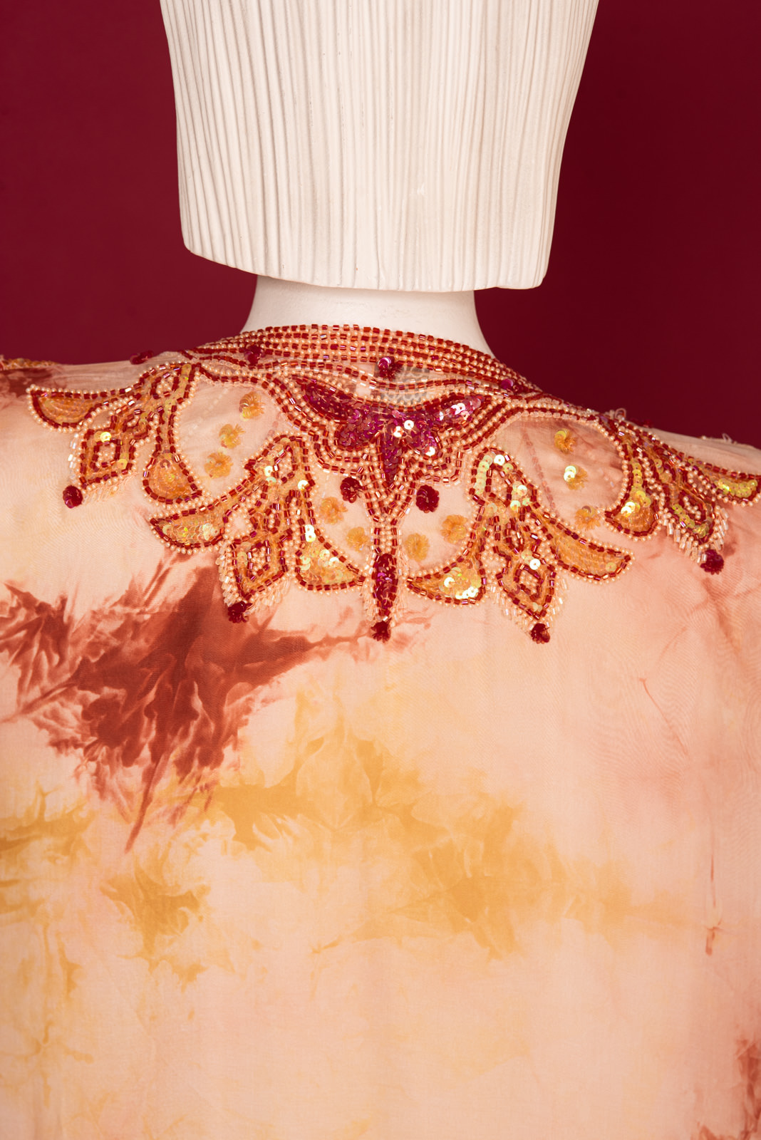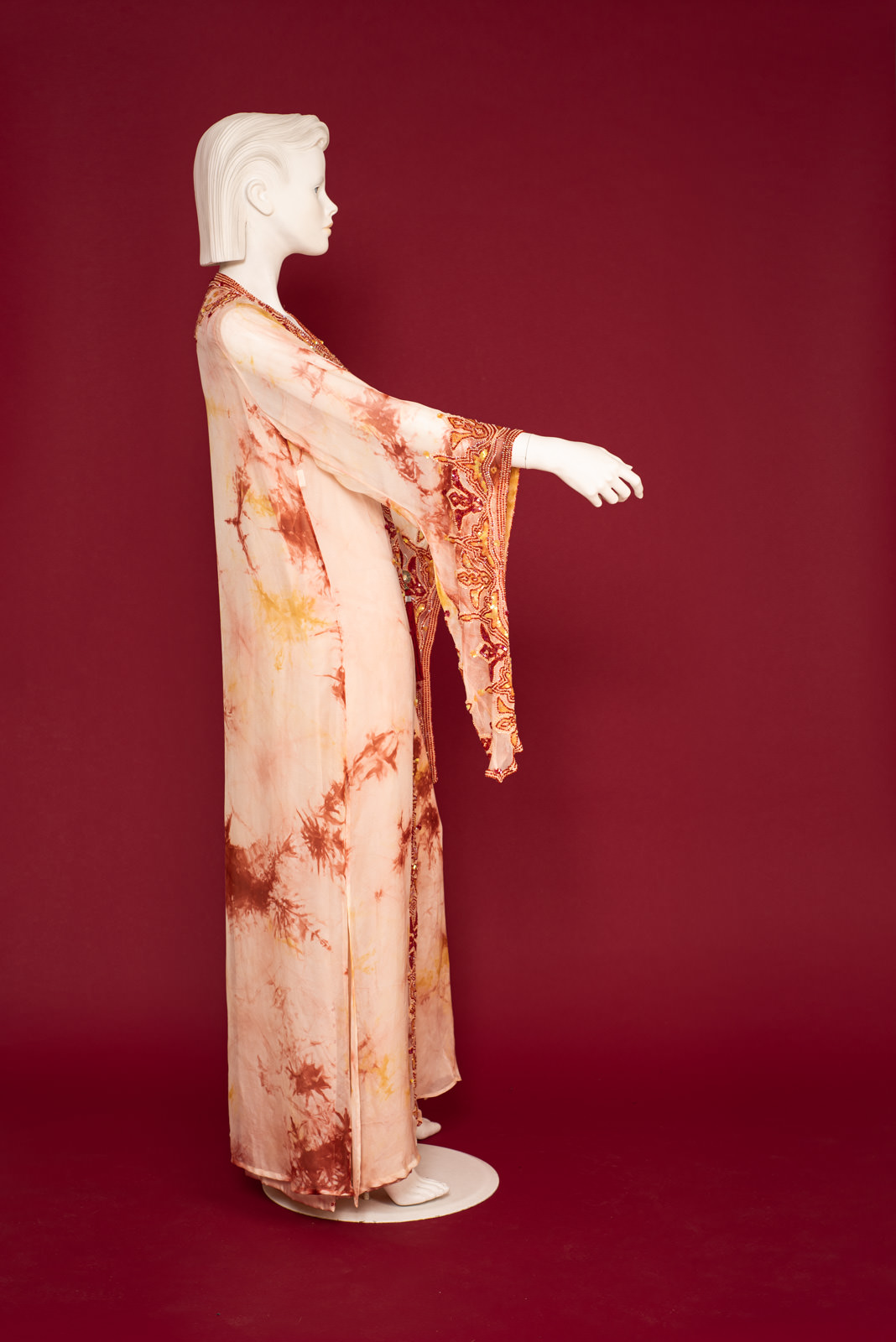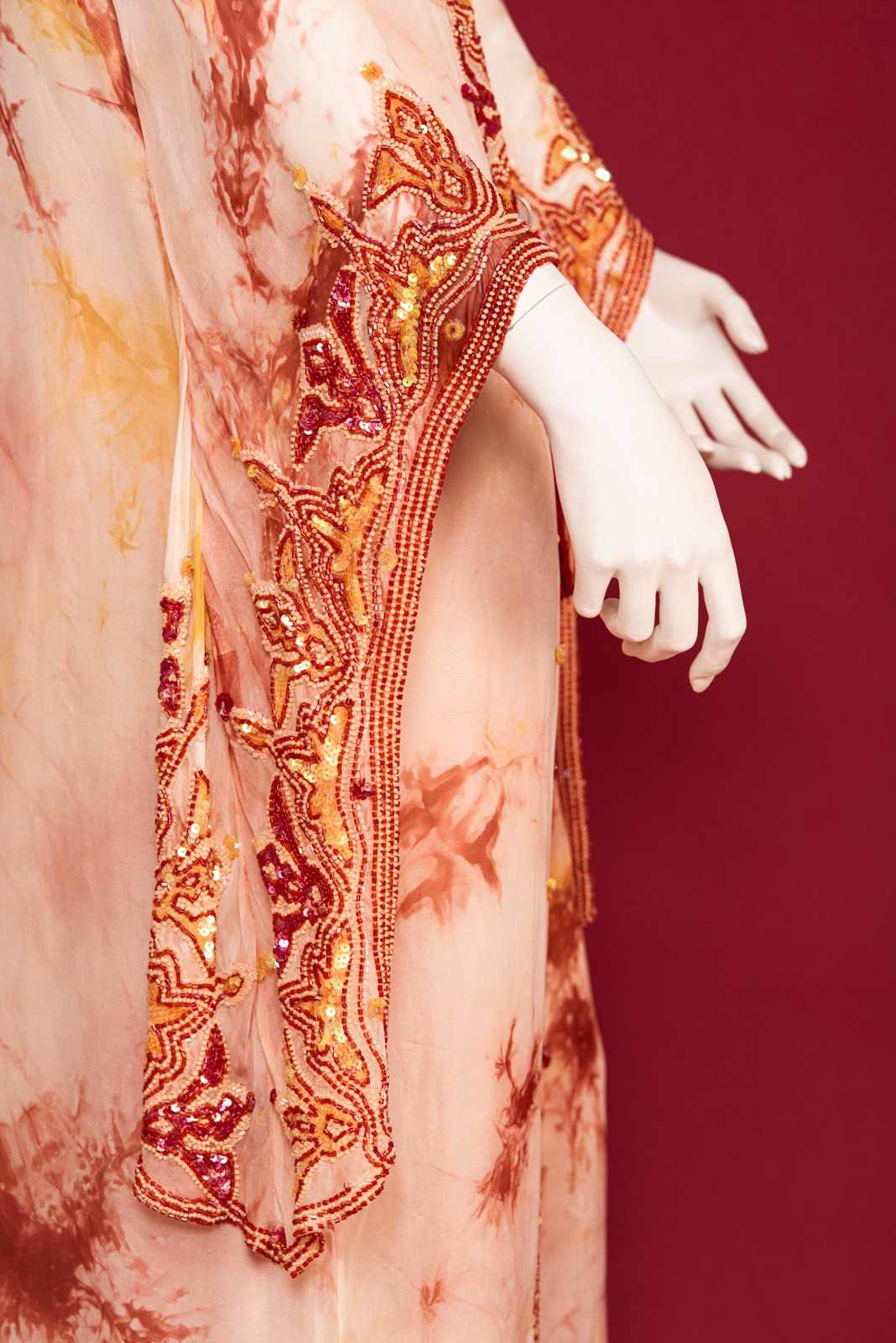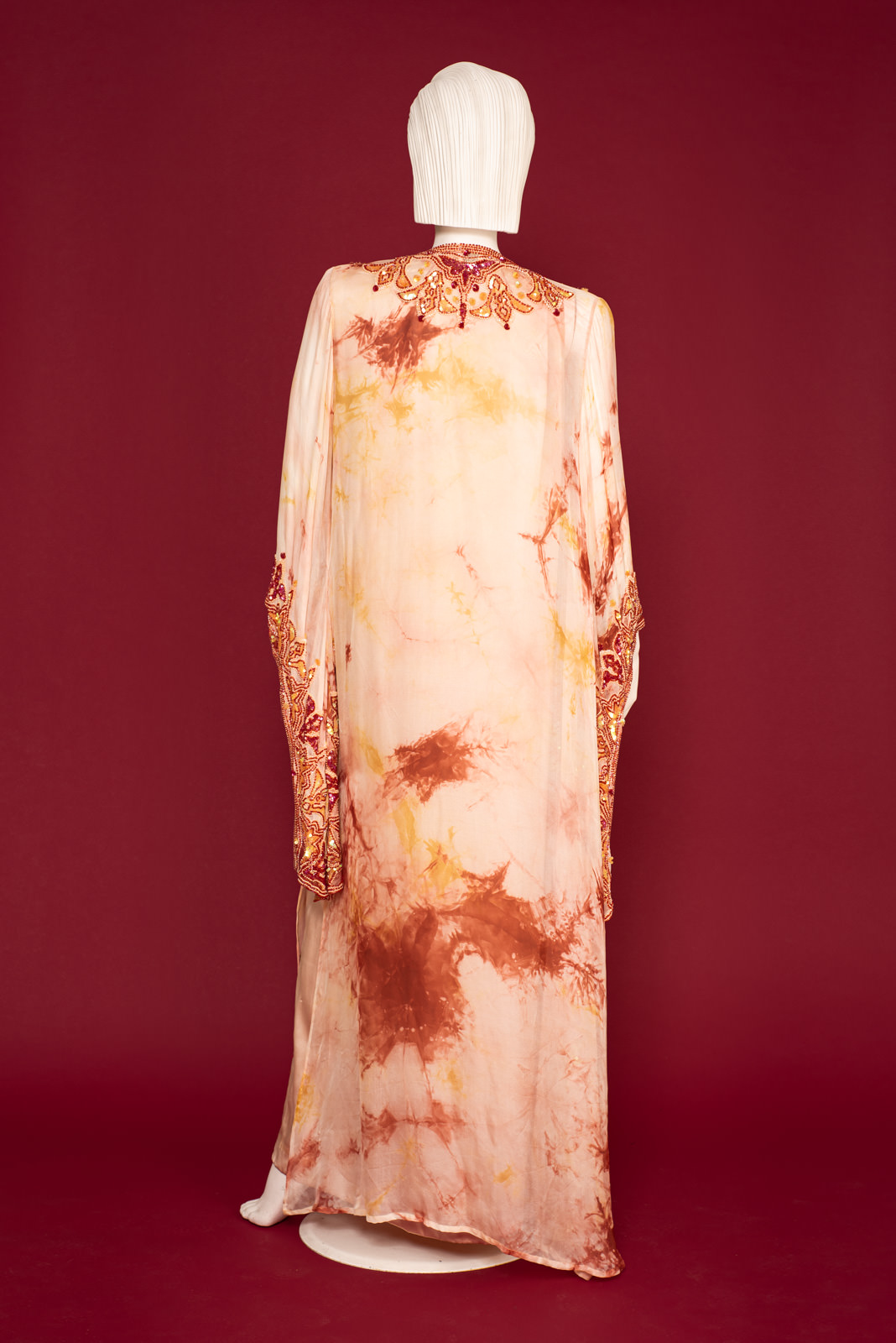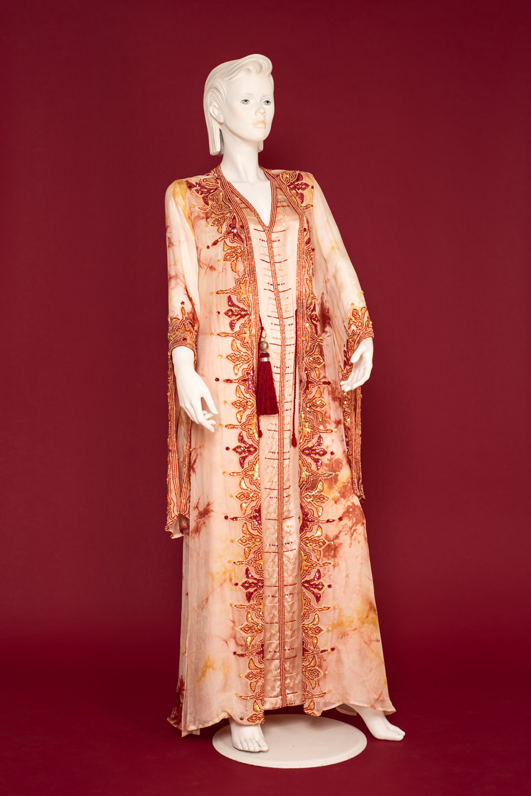 - Richly beaded all along the front folds borders, collar, back collar and on the cuffs with beads forming stylized traditional oriental patterns