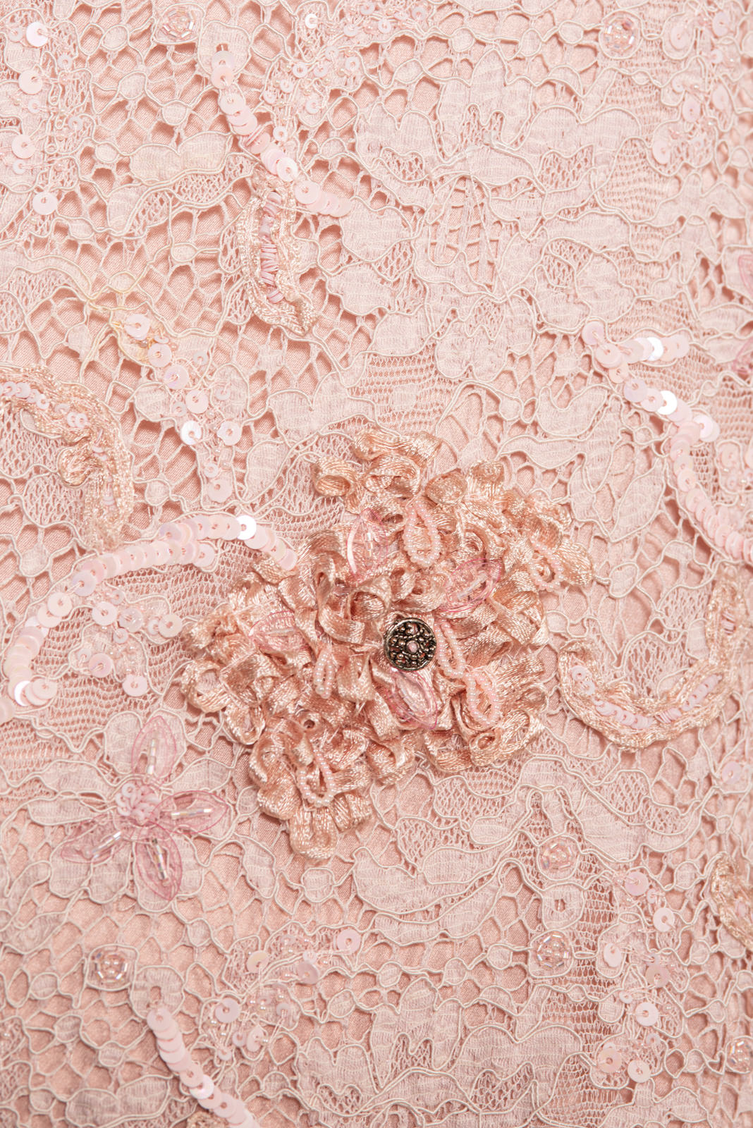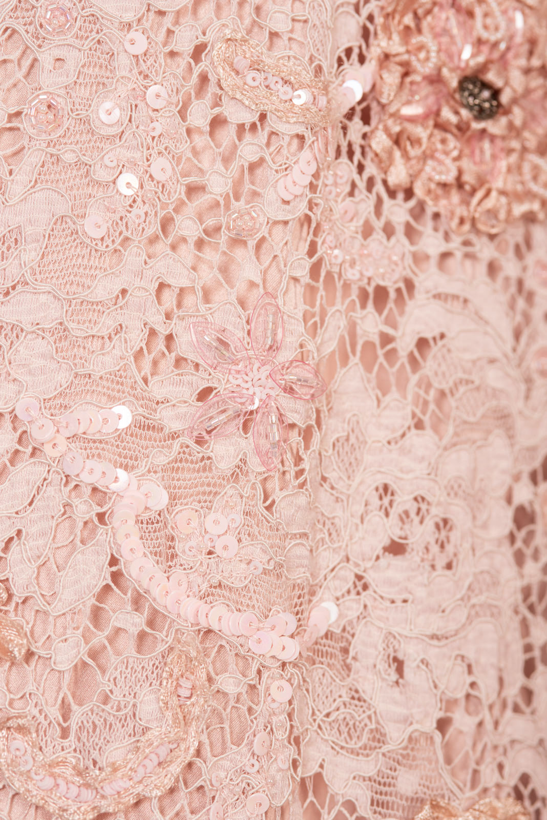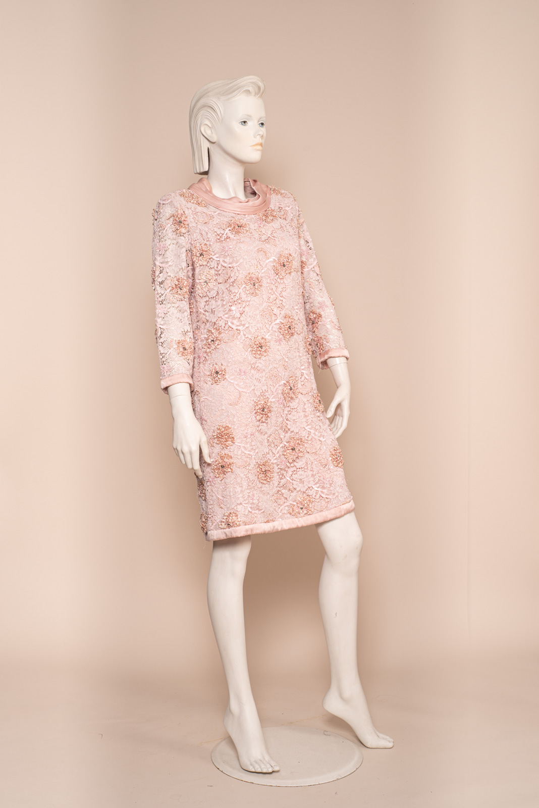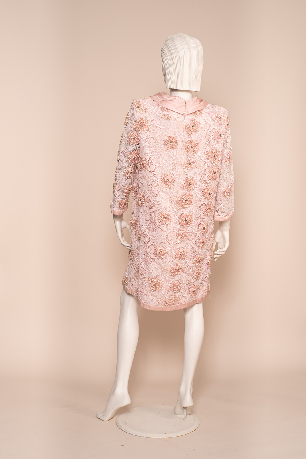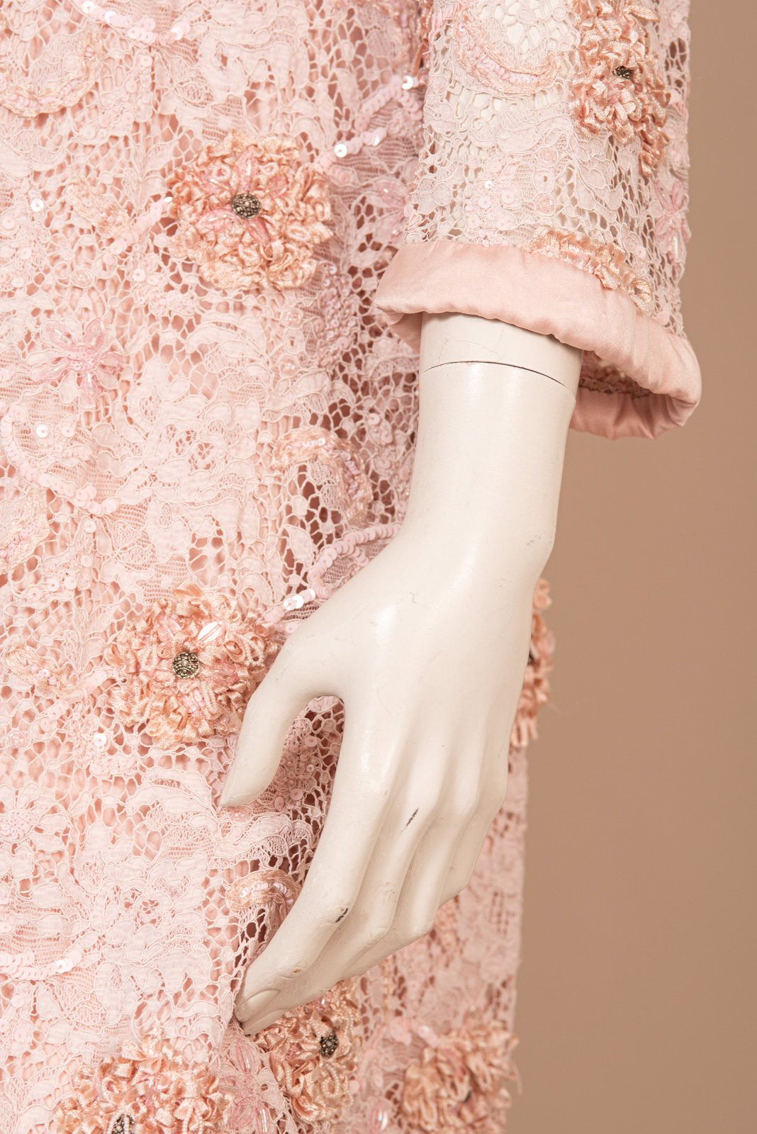 Stunning and rare straight handsewn dress from the 1940s in coral guipure, entirely flower-embroidered with pearls and silk.